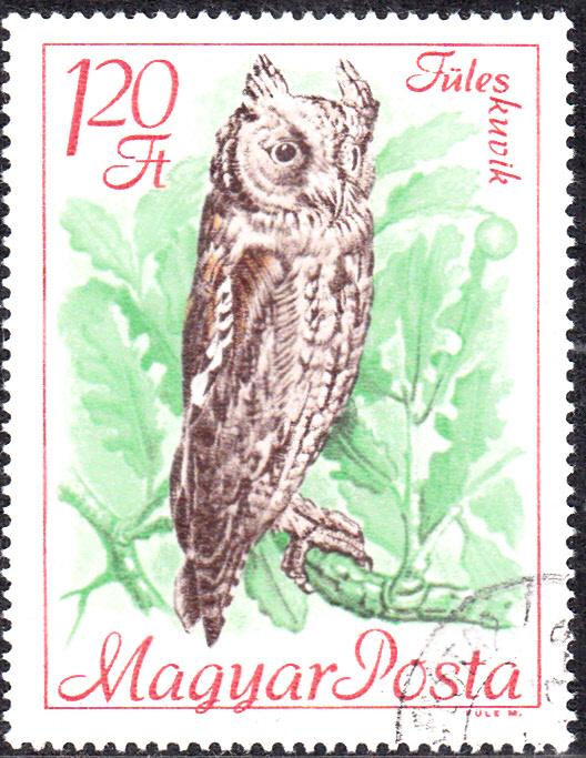 Auf dieser Marke aus Ungarn (MiNr 2402 A) wird uns eine Zwergohreule (Otus scops) vorgestellt.