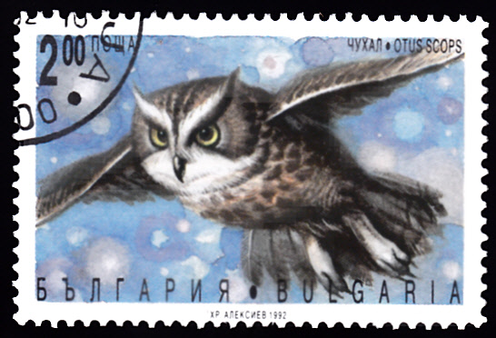 Diese Marke aus Bulgarien (MiNr 4036) zeigt eine Zwergohreule (Otus scops) im Flug.
