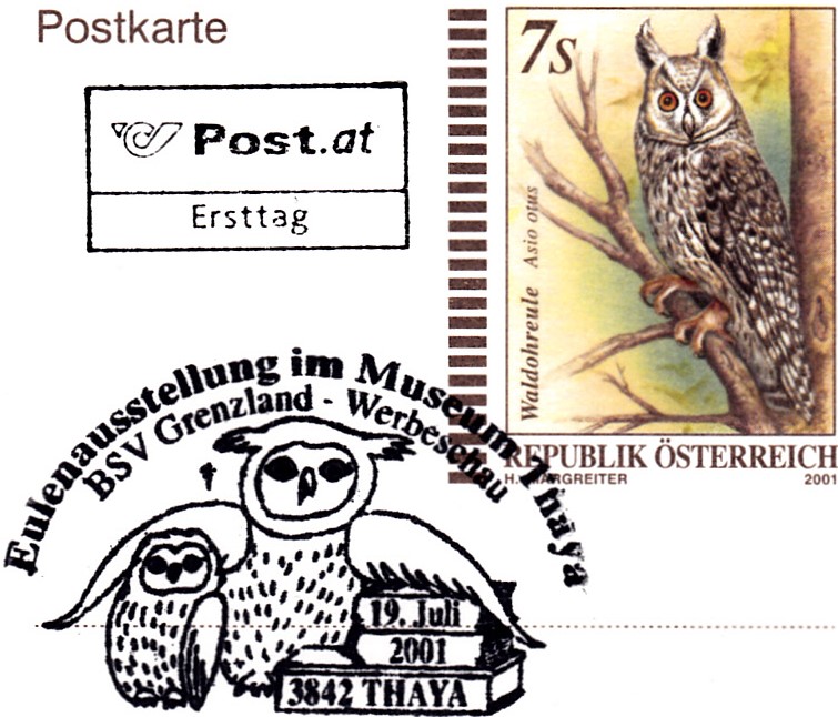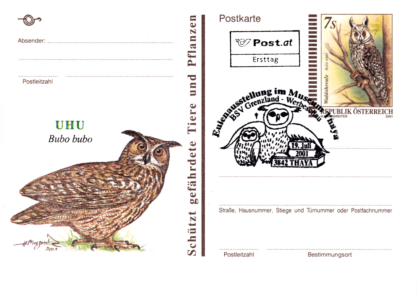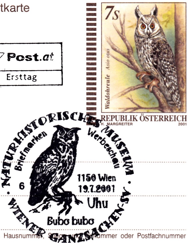 Diese Ganzsache aus Österreich mit dem Wertstempel "Waldohreule" mit einem Zudruck "Uhu" wurde am Ersttag mit einem Sonderstempel aus Wien mit einem Uhu gestempelt.