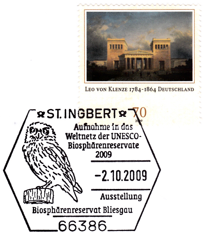 Dieser Sonderstempel vom 2.10.2009 aus St. Ingbert zeigt im Stempelbild einen Steinkauz.