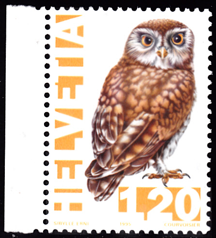 Aus einer Serie "Bedrohte einheimische Tiere" der Schweiz kommt diese Marke (MiNr 1547) mit einem Steinkauz (Athene noctua).
