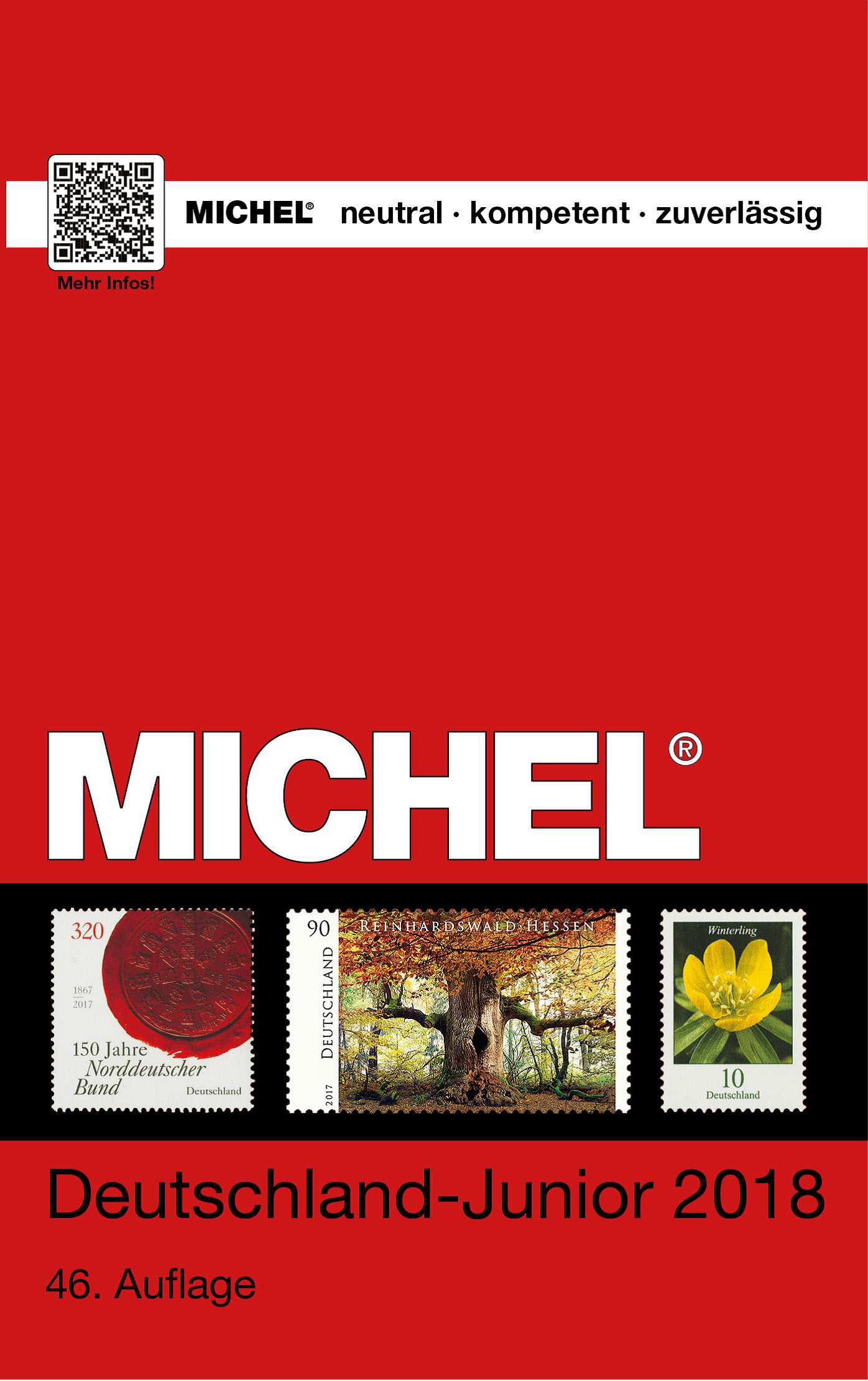 Am 8.Dezember 2017 erscheint der Michel-Junior Deutschland-Katalog 2018 in der 46. Auflage in Farbe mit 620 Seiten im Format 155 x 188 mm kartoniert. Der Katalog kostet in der Papierform 9,95 € und in der MICHEL-Online-Bibliothek 7,00 €. Er enthält folgende Markenausgaben: Altdeutschland, Deutsches Reich, Auslandspostämter, Kolonien, Besetzungsausgaben des Ersten und Zweiten Weltkrieges, Abstimmungsgebiete (mit Saargebiet), Danzig, Memel, Böhmen und Mähren, Generalgouvernement, Sudetenland, Feldpostmarken, Lokalausgaben, Alliierte Besetzung (Gemeinschaftsausgaben, Berlin und Brandenburg, SBZ, Französische Zone, Amerikanische und Britische Zone), DDR, Berlin (West), Saarland und BRD.