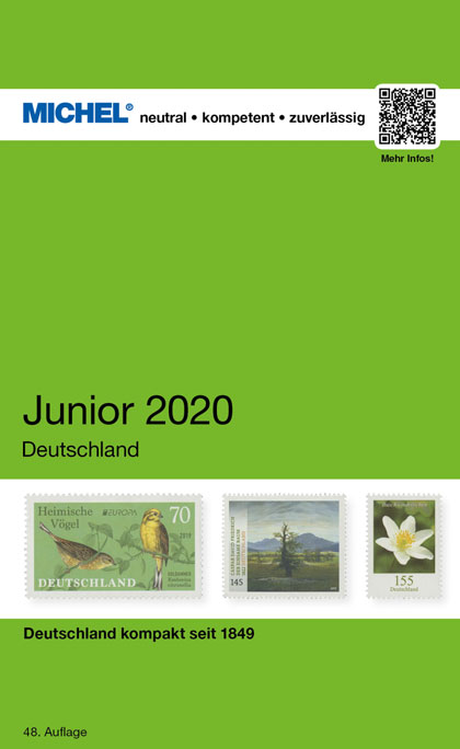 Am 6.Dezember 2019 erschien der Michel-Junior Deutschland-Katalog 2020 in der 48. Auflage in Farbe mit 660 Seiten im Format 115 x 188 mm kartoniert. Der Katalog kostet in der Papierform 9,95 € und in der MICHEL-Online-Bibliothek 7,00 €. Er enthält folgende Markenausgaben: Altdeutschland, Deutsches Reich, Auslandspostämter, Kolonien, Besetzungsausgaben des Ersten und Zweiten Weltkrieges, Abstimmungsgebiete (mit Saargebiet), Danzig, Memel, Böhmen und Mähren, Generalgouvernement, Sudetenland, Feldpostmarken, Lokalausgaben, Alliierte Besetzung (Gemeinschaftsausgaben, Berlin und Brandenburg, SBZ, Französische Zone, Amerikanische und Britische Zone), DDR, Berlin (West), Saarland und BRD.