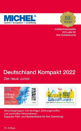 Am 3.Dezember 20201erschien der Deutschland Kompakt 2022, der neue Junior, in der 50. Auflage in Farbe mit 680 Seiten im Format 115 x 188 mm kartoniert. Der Katalog kostet in der Papierform 15,00 €. Er enthält folgende Markenausgaben: Altdeutschland, Deutsches Reich, Auslandspostämter, Kolonien, Besetzungsausgaben des Ersten und Zweiten Weltkrieges, Abstimmungsgebiete (mit Saargebiet), Danzig, Memel, Böhmen und Mähren, Generalgouvernement, Sudetenland, Feldpostmarken, Lokalausgaben, Alliierte Besetzung (Gemeinschaftsausgaben, Berlin und Brandenburg, SBZ, Französische Zone, Amerikanische und Britische Zone), DDR, Berlin (West), Saarland und BRD.