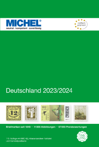 Heute am 7.7.2023 erschien ein neuer Michel Deutschland 2023/2024 in der 110. Auflage in Farbe mit 1184 Seiten im Format 155 x 230 mm als Hardcover. Der Katalog kostet in der Papierversion 79,00 € und als E-Book in der Online-Bibliothek 55,00 €.