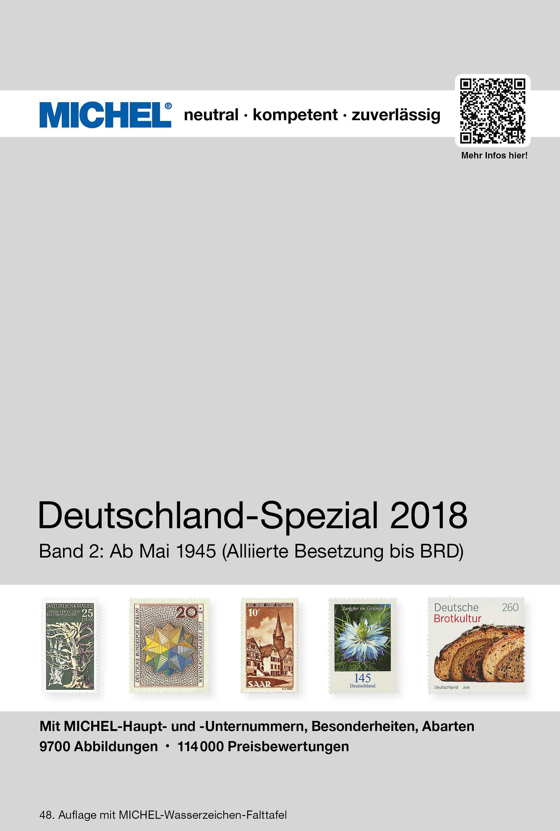 Der Deutschland-Spezial-Katalog 2018 – Band 2 (Ab Mai 1945, Alliierte Besetzung bis BRD) erschien in der 48. Auflage wieder in Farbe mit insgesamt 1440 Seiten im Format: 155 x 230 mm als Hardcover mit farbigen Lesebändchen. Erstverkaufstag war der 5. April 2019. Der Katalog kostet in der Papierform 89,90 € und als E-Book in der Online-Bibliothek 69,00 €.