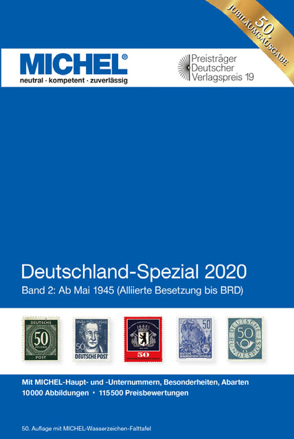 Der Deutschland-Spezial-Katalog 2020 – Band 2 (Ab Mai 1945, Alliierte Besetzung bis BRD) erscheint in der 50. Auflage wieder in Farbe mit insgesamt 1472 Seiten im Format: 155 x 230 mm als Hardcover mit farbigen Lesebändchen und Wasserzeichen-Falttafel. Erstverkaufstag ist der 3. April 2020. Der Katalog kostet 89,90 €.