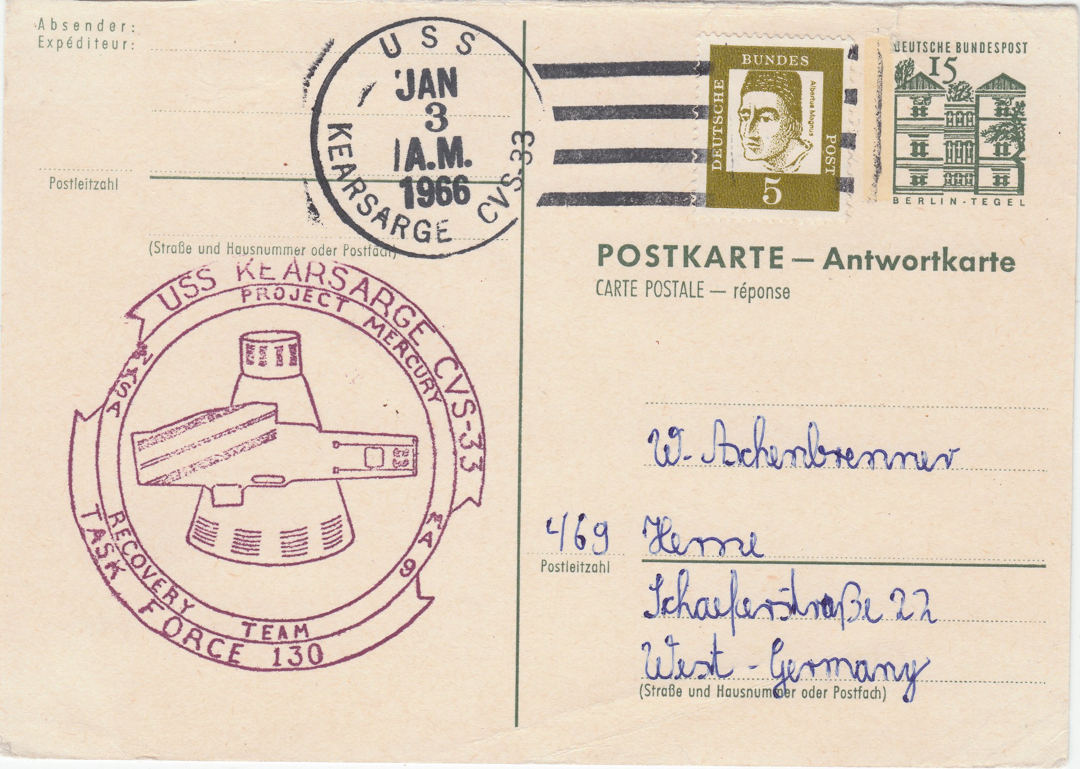 Dieser Beleg vom 03.01.1966 trägt einen Cachetstempel, der das schräg angeordnete Flugdeck des Schiffes sehr gut darstellt.
