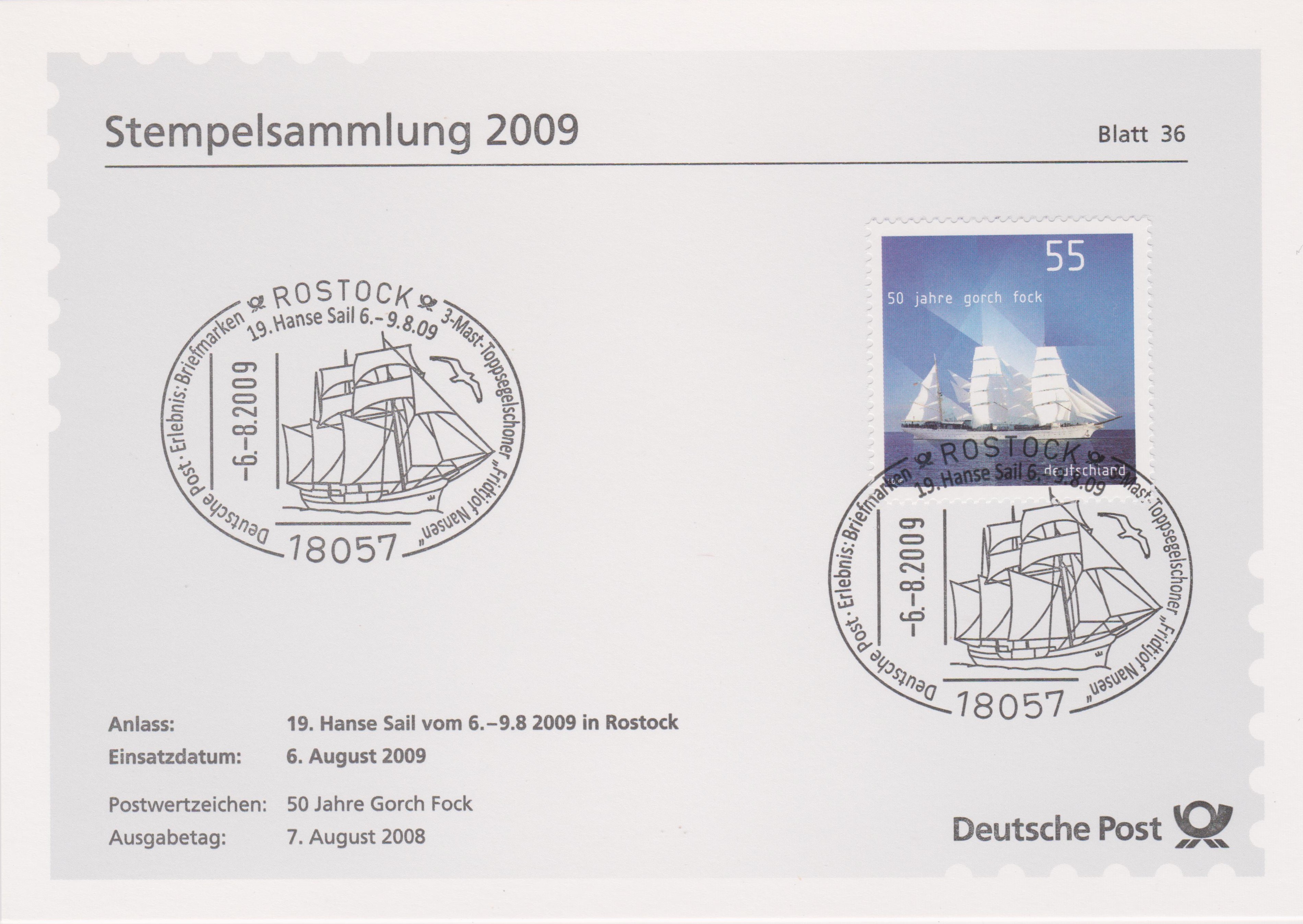 Blatt 36 der Deutsche Post Stempelsammlung 2009 zeigt einen Sonderstempel vom 06.08.2009 mit dem "3-Mast-Topsegelschoner FRIDJOF NANSEN":