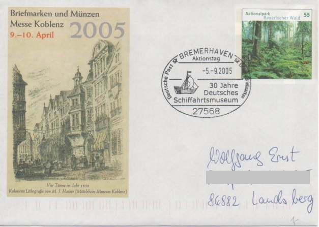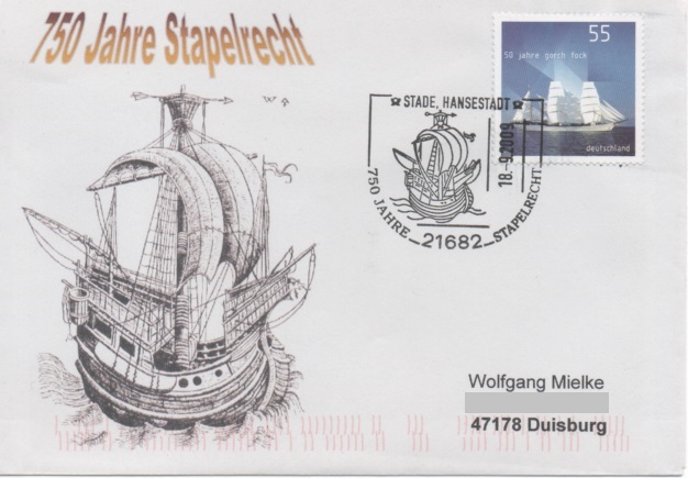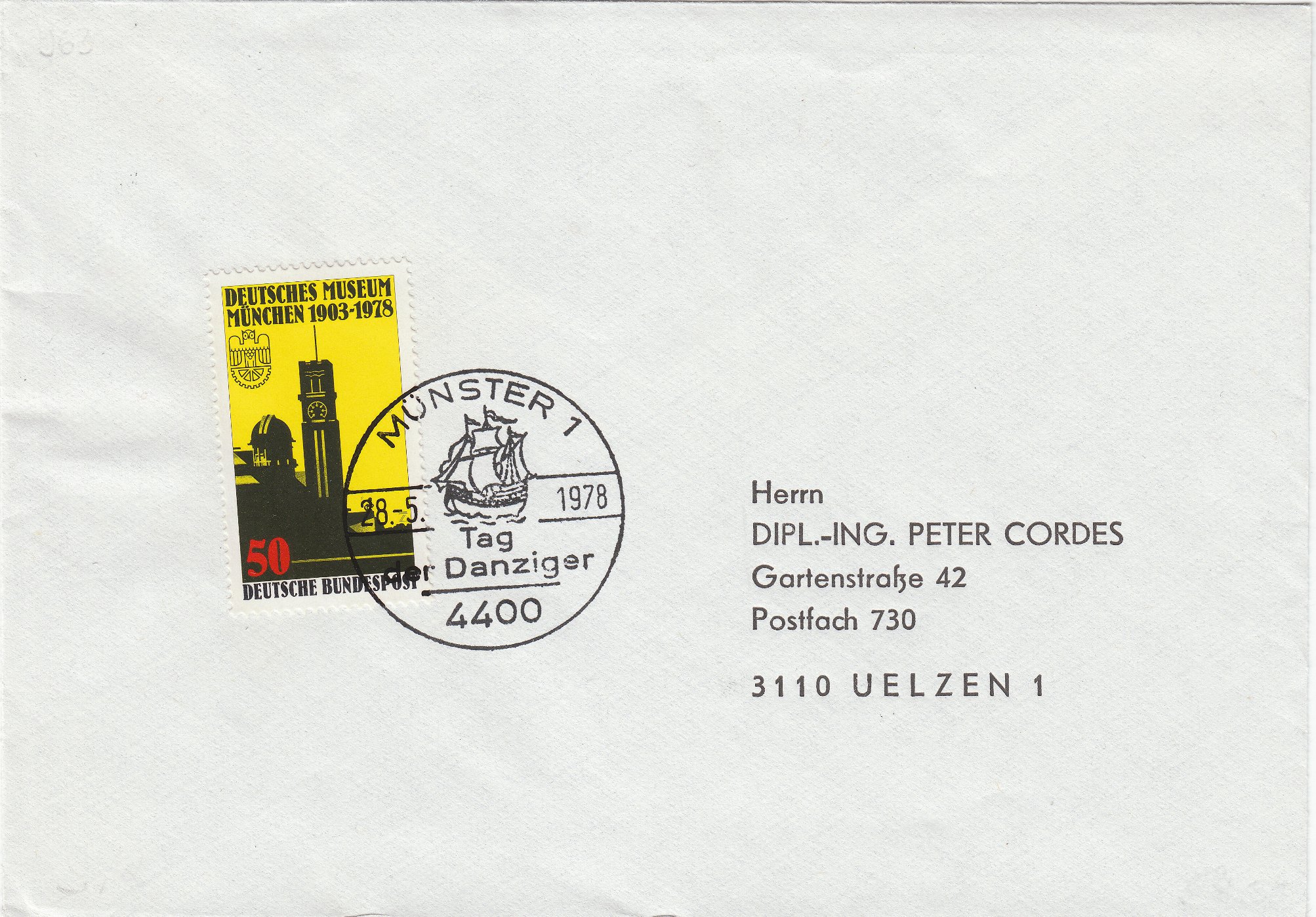 Dieser Beleg zeigt einen Sonderstempel vom 28.05.1978 aus Münster "Tag der Danziger", der als Motiv im Stempelbild einen Holk zeigt: