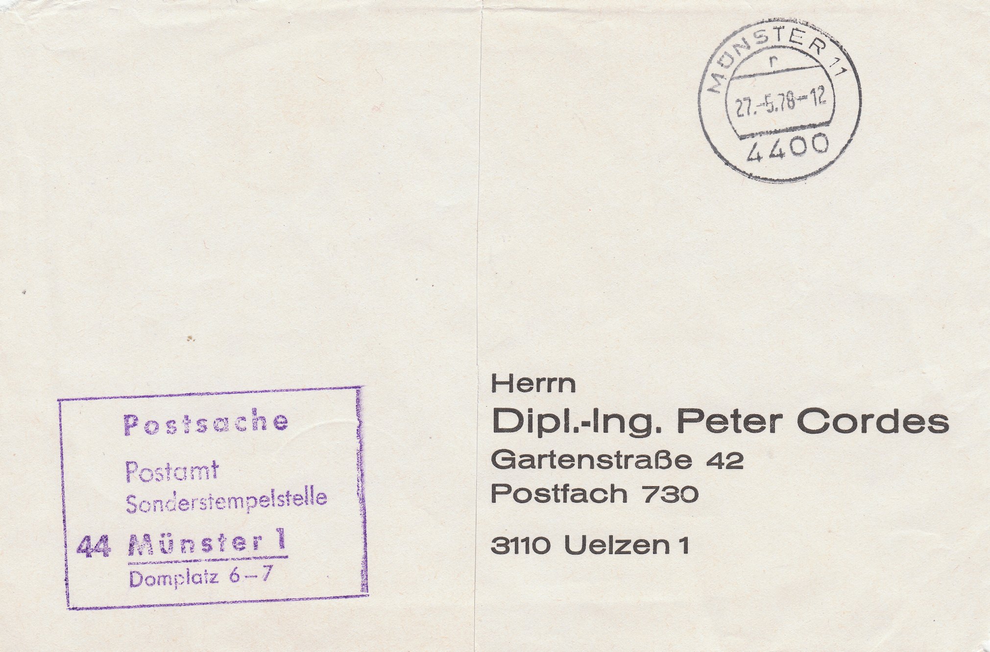 In diesem Umschlag steckte noch ein Ausschnitt der Vorderseite des Umschlages der Postsache mit Absenderstempel "Postsache Postamt Sonderstempelstelle 44 Münster 1 Domplatz 6-7", in dem dieser Beleg nach Aufbringung des gewünschten Sonderstempels an den Absender zurück geschickt wurde. Diese Postsache trägt einen Tagesstempel MÜNSTER 11 vom 27.05.1978 um 12 Uhr: