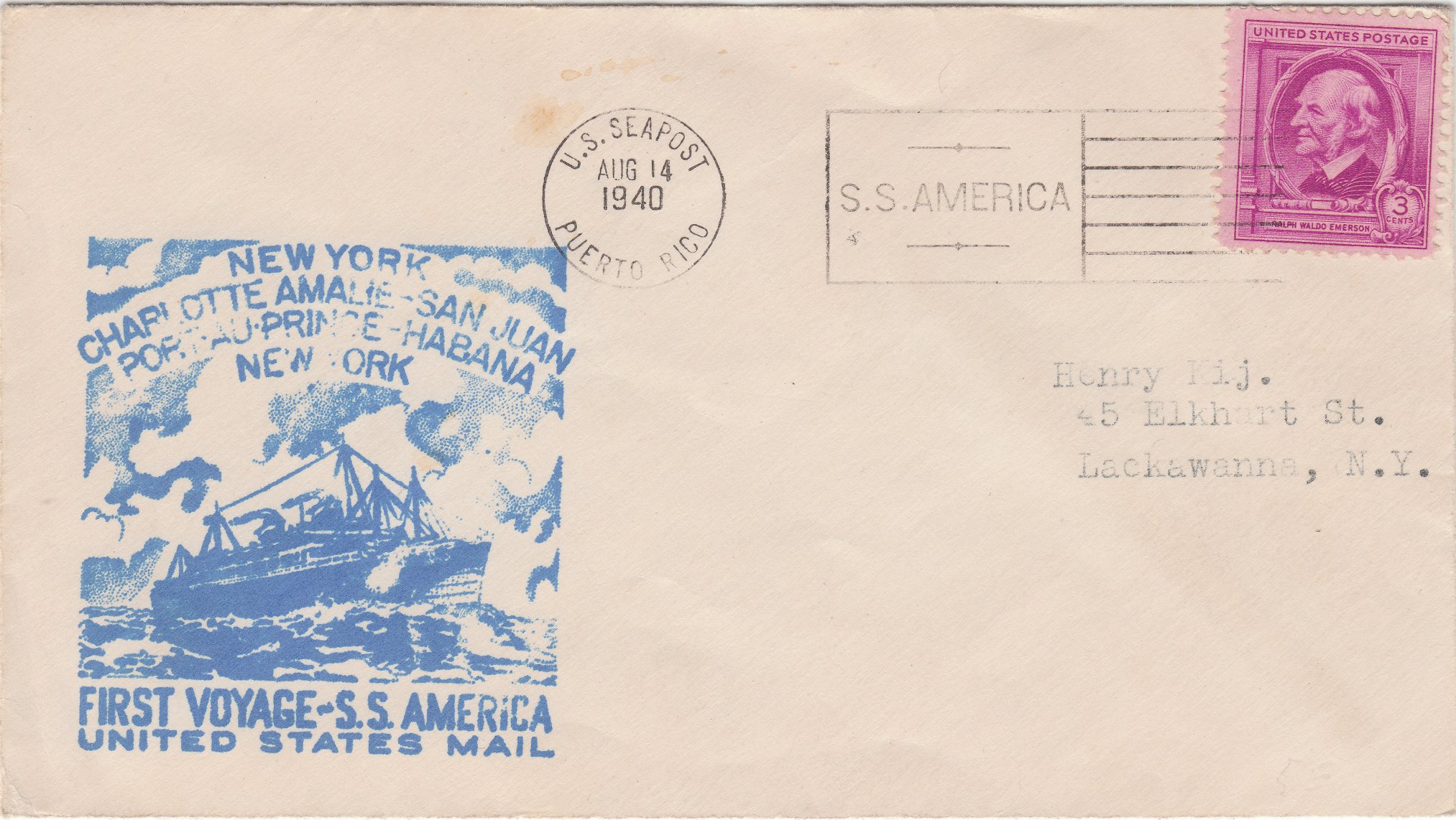 Dieser Beleg dokumentiert am 14.08.1940 diese erste Kreuzfahrt mit einem Seepoststempel des Schiffes, der in PUERTO RICO abgeschlagen wurde, das zu den Großen Antillen gehört:
