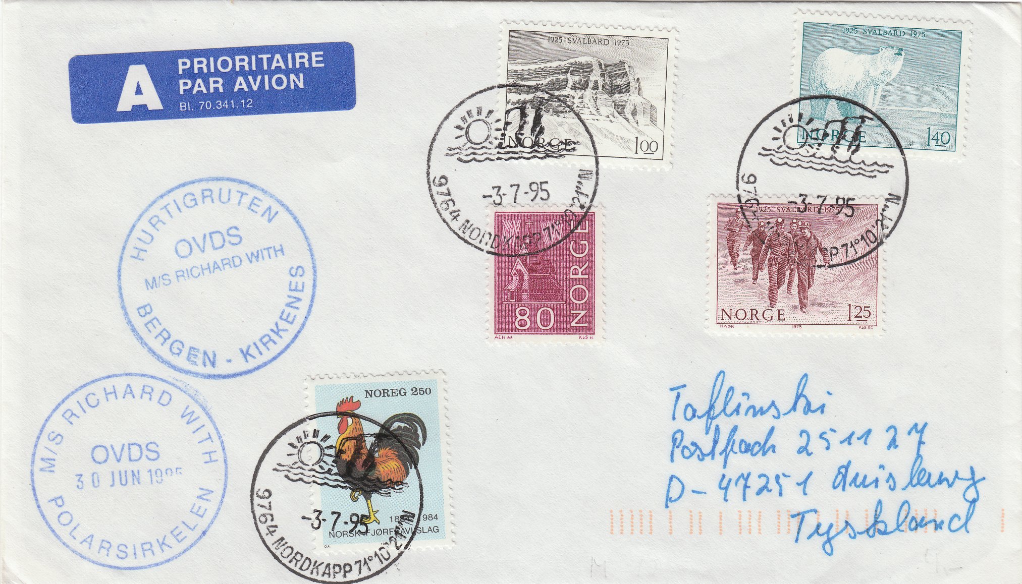 http://hurtigwiki.de/geschichteDieser Beleg wurde am 30.06.1995 zur Überquerung des Polarkreises an Bord der MS RICHARD WITH aufgegeben und dann am 03.07.1995 am Nordkap der norwegischen Post übergeben, die die Frankatur entwertete und für die Ableitung des Briefes nach Deutschland sorgte: