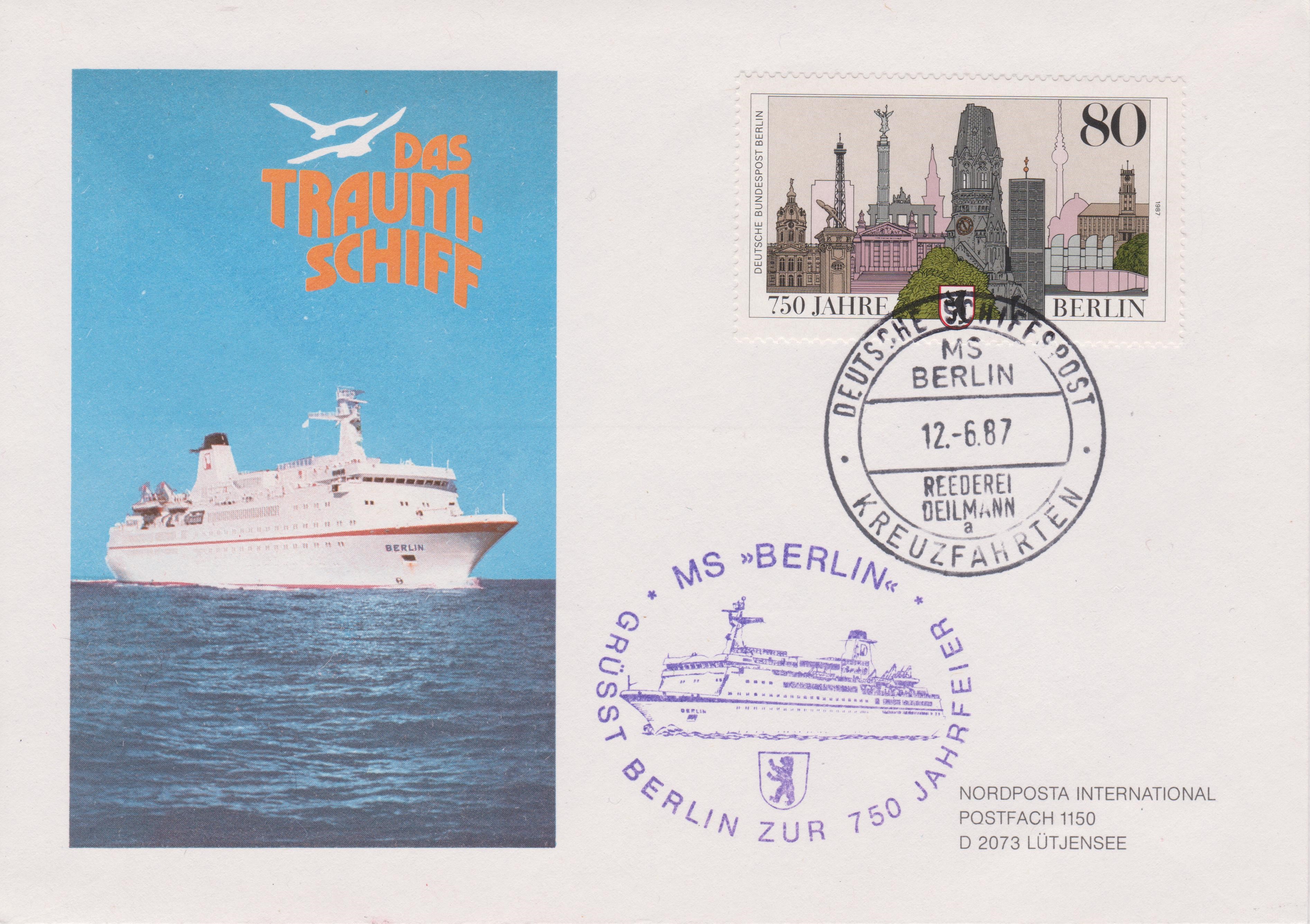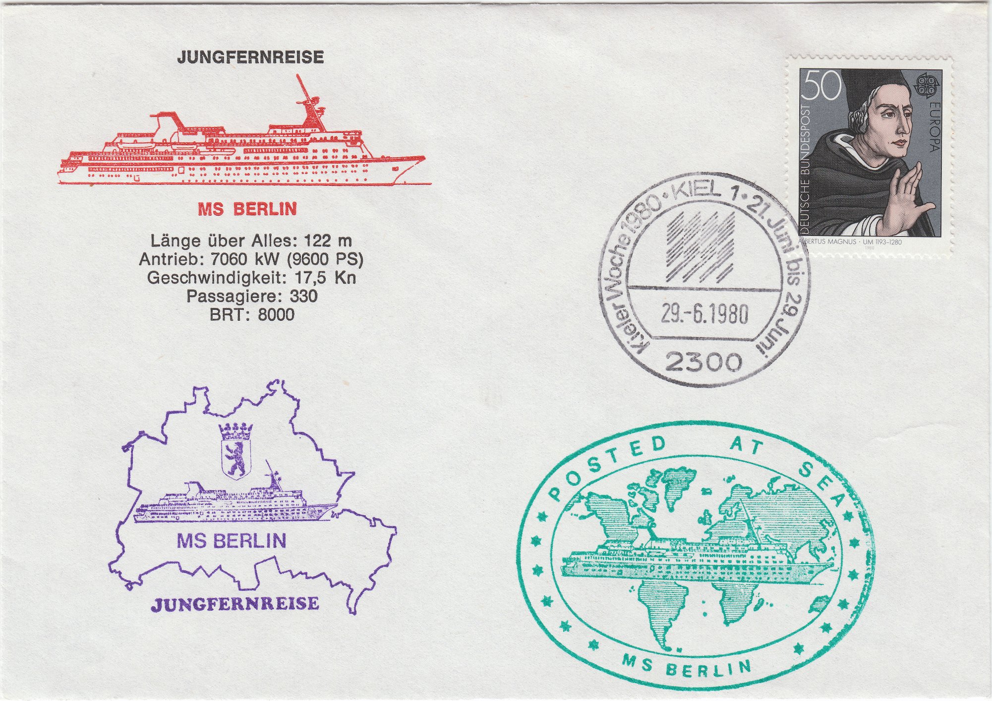Den Stapellauf der MS BERLIN als "Neubau Nr. 163 der Howaldtswerke - Deutsche Werft AG Hamburg und Kiel, Werk Kiel" am 12.01.1980, dokumentiert dieser Beleg: