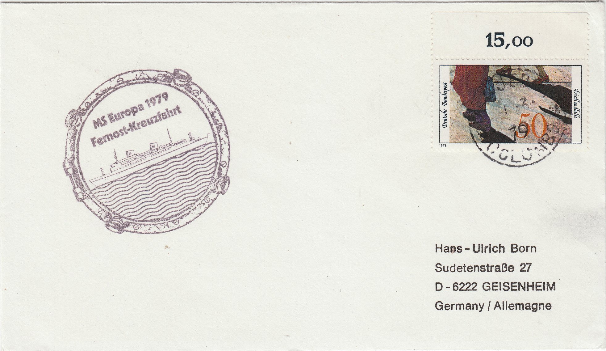Das Eckrandstück mit Formnummer 2 der deutschen Ausgabe der Europamarke 1981 wurde am 28.09.1981 an Bord des Schiffes mit dem Schiffspoststempel der MS EUROPA entwertet. Am folgenden Tag, dem 29.09.1981, wurde der Beleg dann in Malaga der spanischen Post zur Weiterbeförderung übergeben, was ein Tagesstempel "PAQUEBOT" dokumentiert.