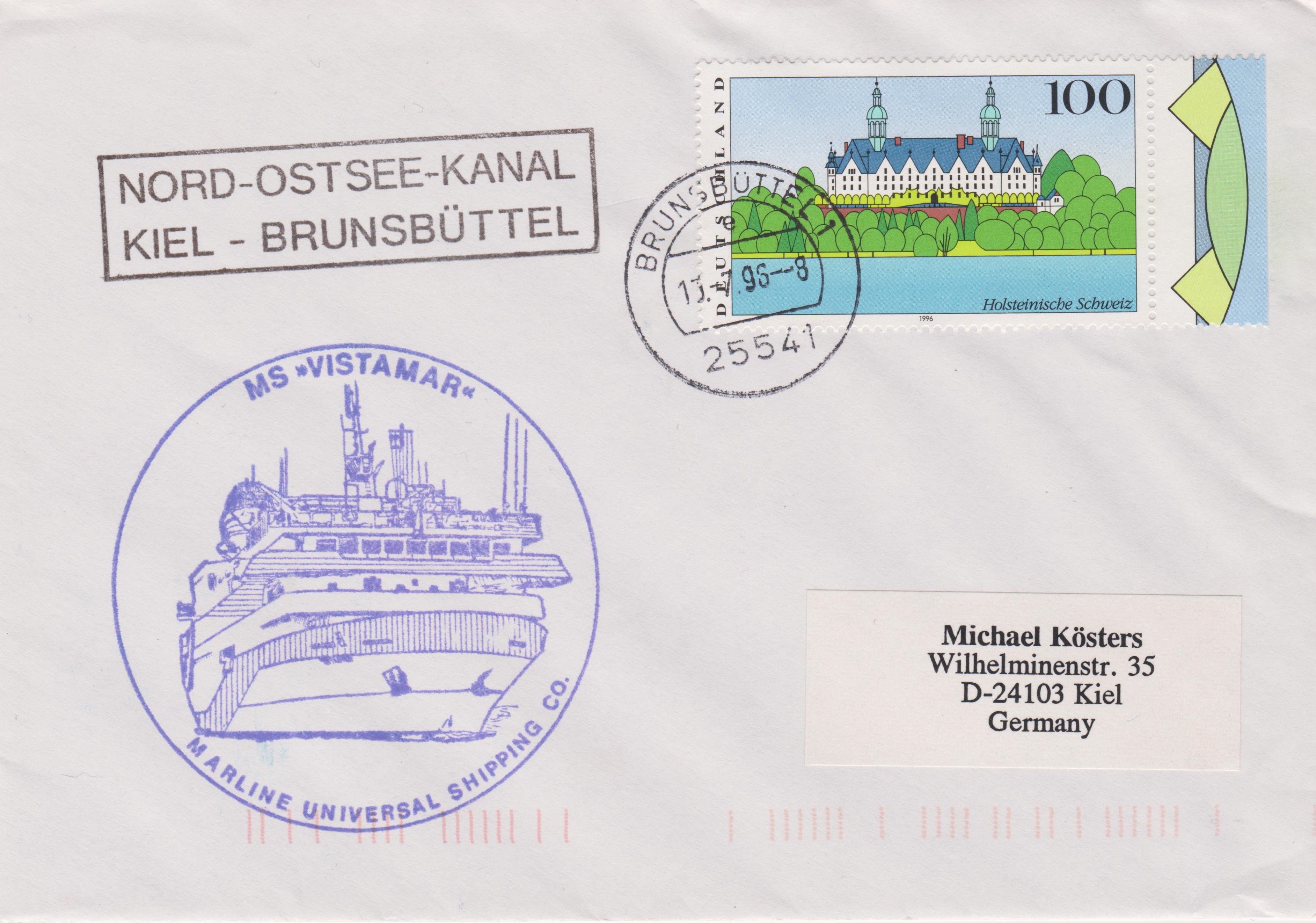 Dieser Beleg mit einer Einzelfrankatur der Bund MiNr. 1849 mit Tagesstempel "BRUNSBÜTTEL 1" dokumentiert eine Fahrt der MS VISTAMAR durch den NORD-OSTSEE-KANAL am 13.07.1996: