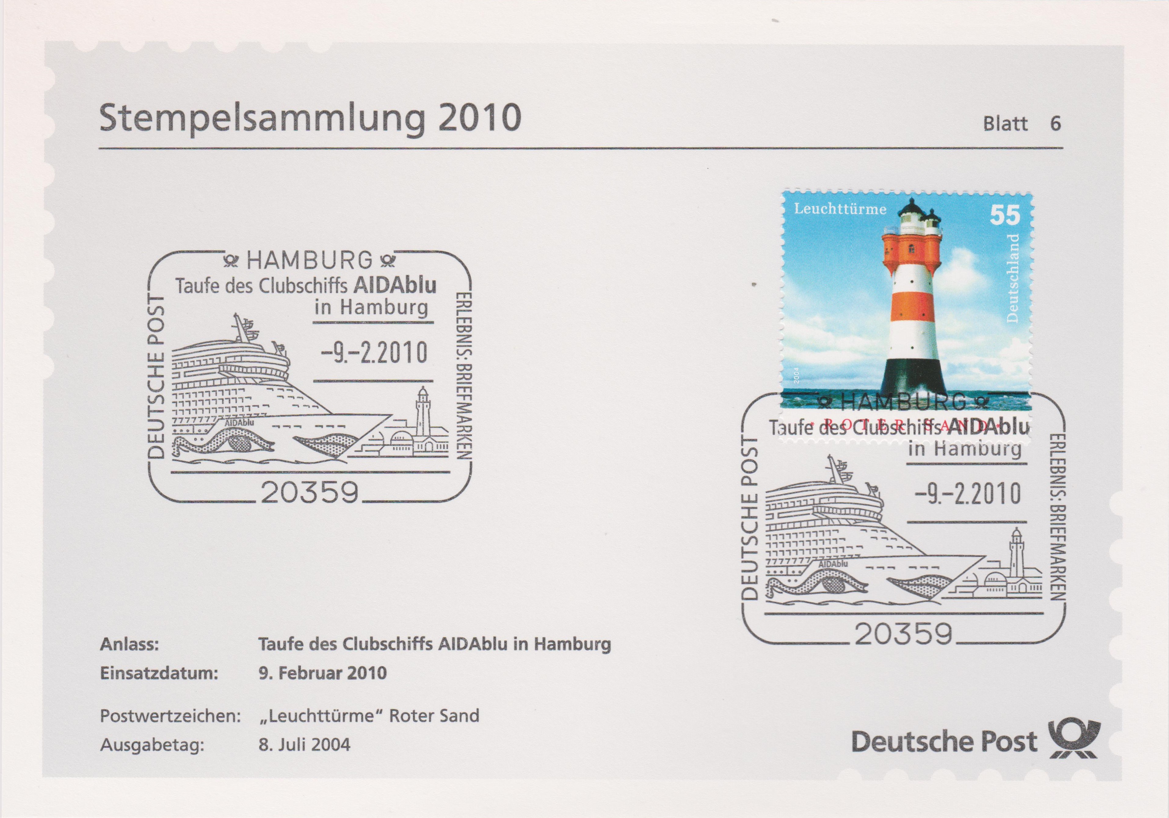 Dieses Blatt 6 der Deutsche Post Stempelsammlung 2010 dokumentiert per Sonderstempel die Taufe der AIDAblu in Hamburg am 09.02.2010: