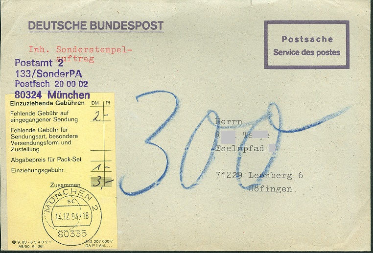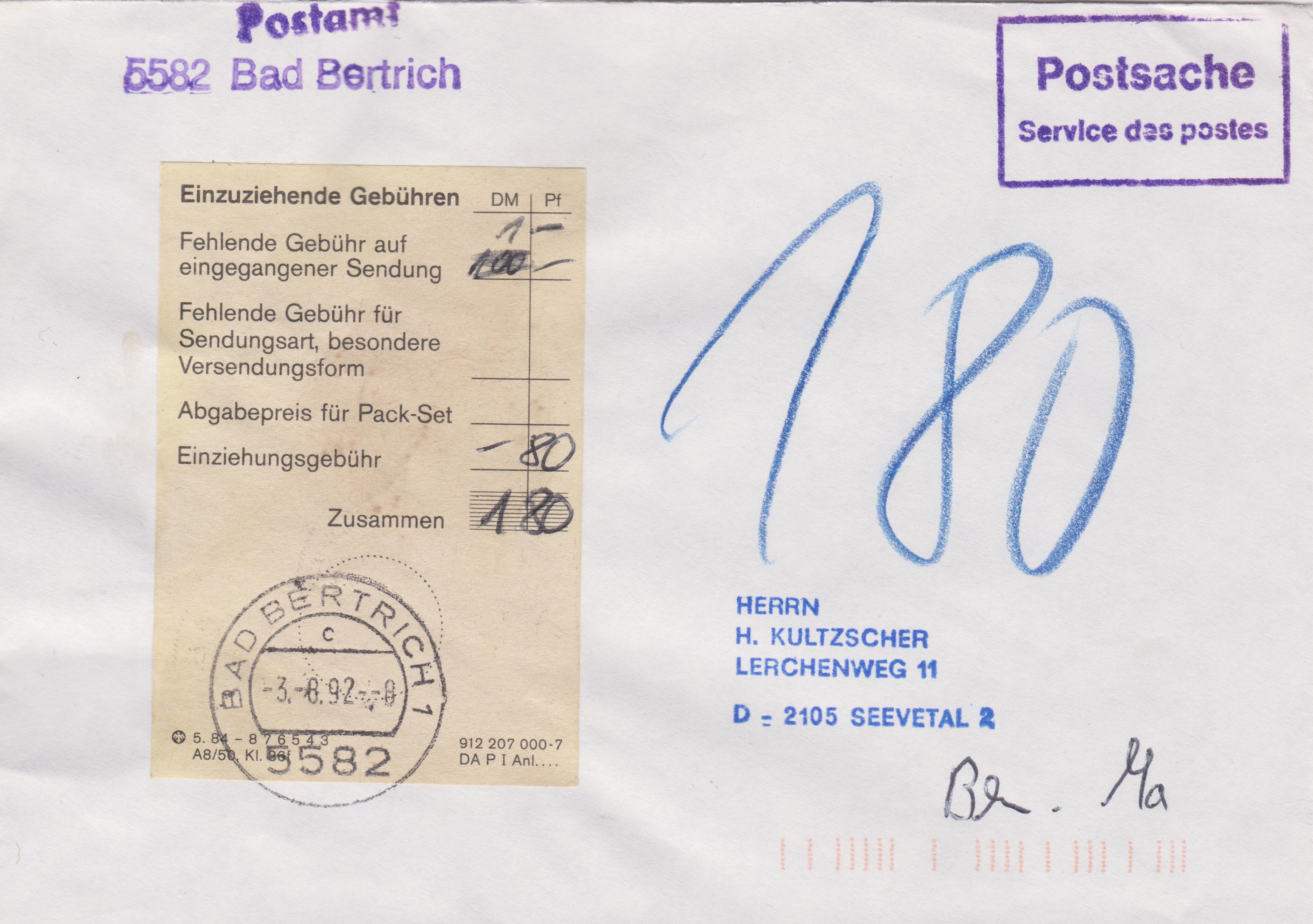 Diese "Nachgebühr" bezieht sich, wie aus dem gelben Aufkleber hervorgeht, nicht auf die gezeigte Postsache, sondern auf eine vom Adressaten verschickte Sendung, die wohl unfrei beim Versender der Postsache ankam.