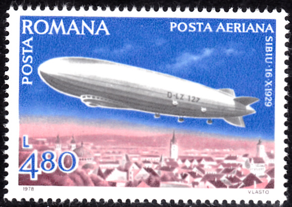 Aus Rumänien kommt diese Marke (MiNr 3503), die LZ 127 während der Balkanfahrt über Brașov zeigt.