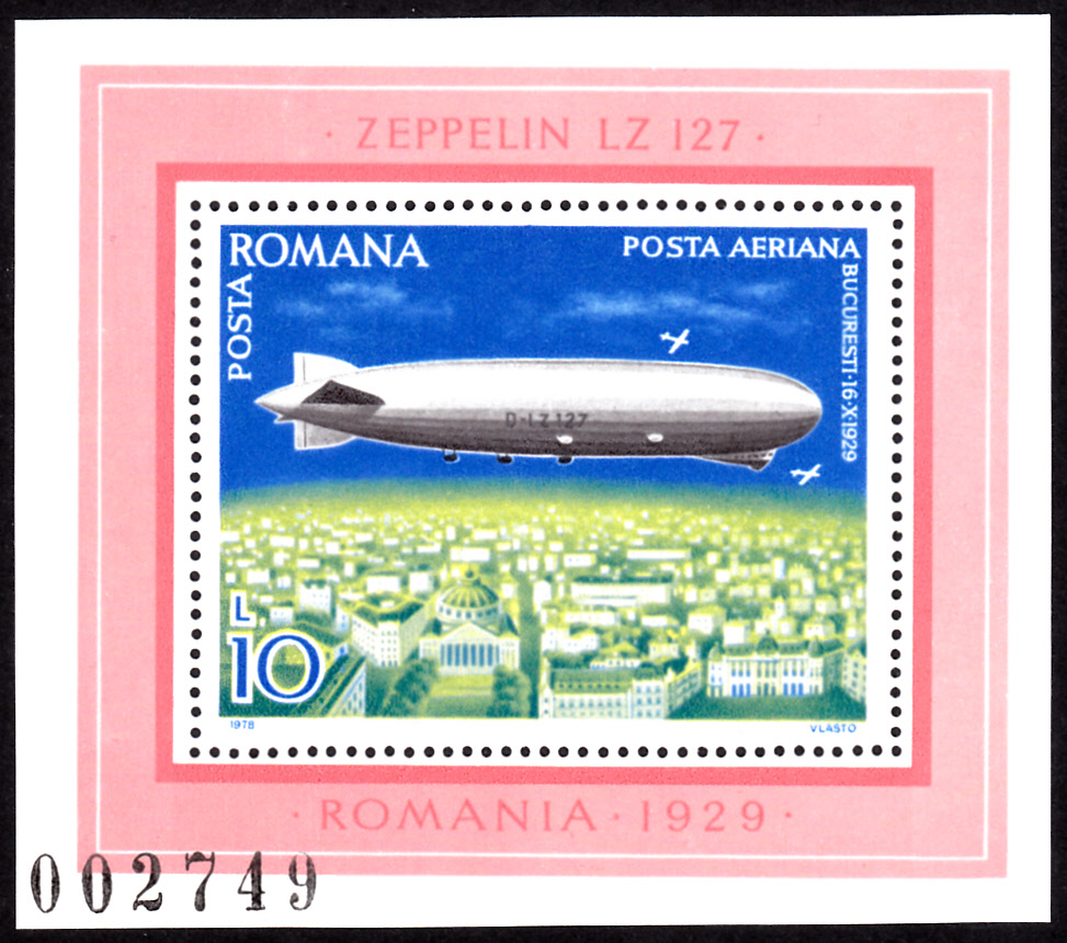 Zu der Ausgabe aus Rumänien gehört auch noch ein Block (MiNr Block 148) mit einer Marke (MiNr 3505). Auf der Marke wird LZ 127 über Bukarest gezeigt.