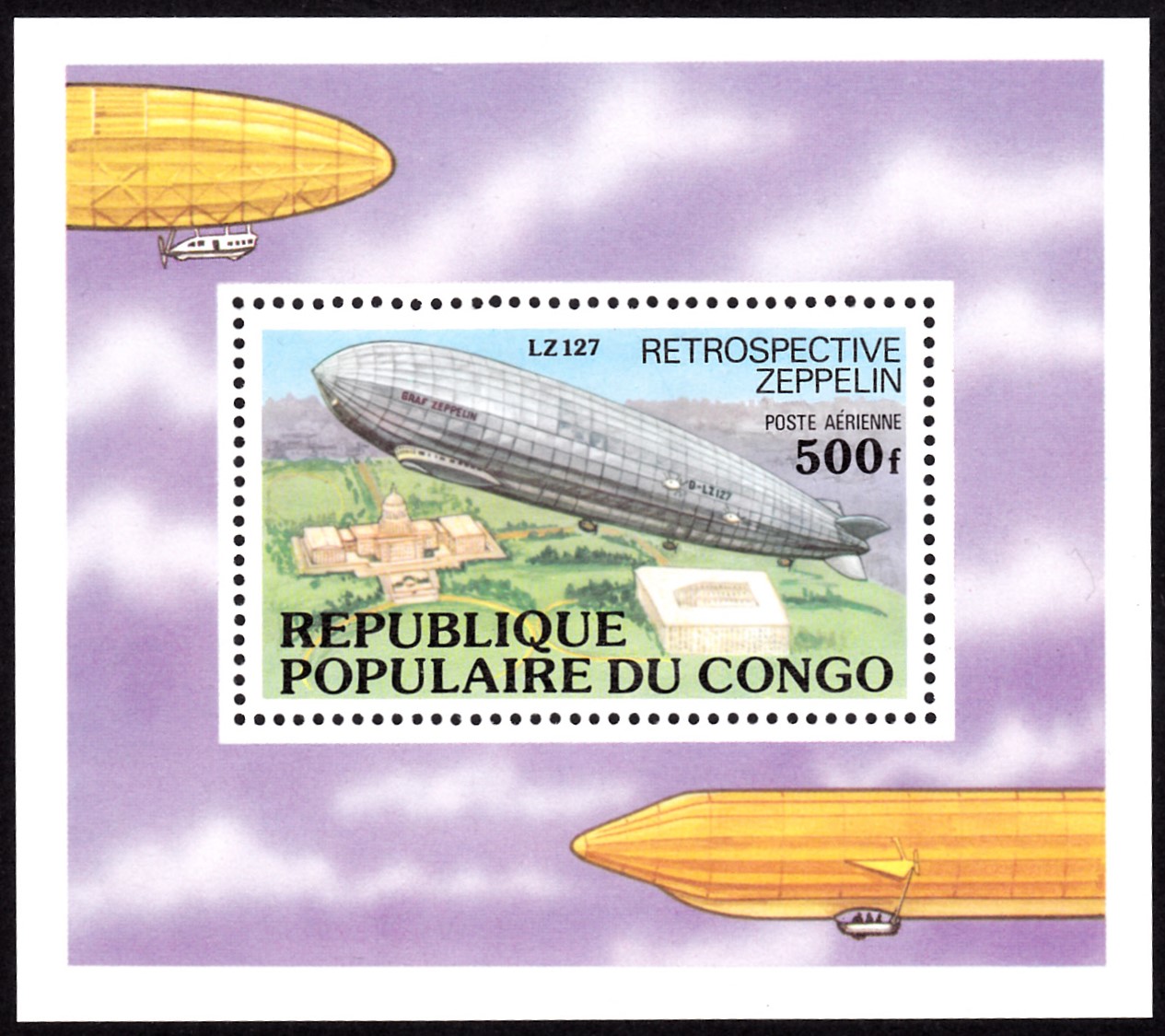 Auf der Marke aus dem Kongo-Brazzaville (MiNr 582) im Block (MiNr Block 11) wird LZ 127 "Graf Zeppelin" über dem Capitol in Washington gezeigt.