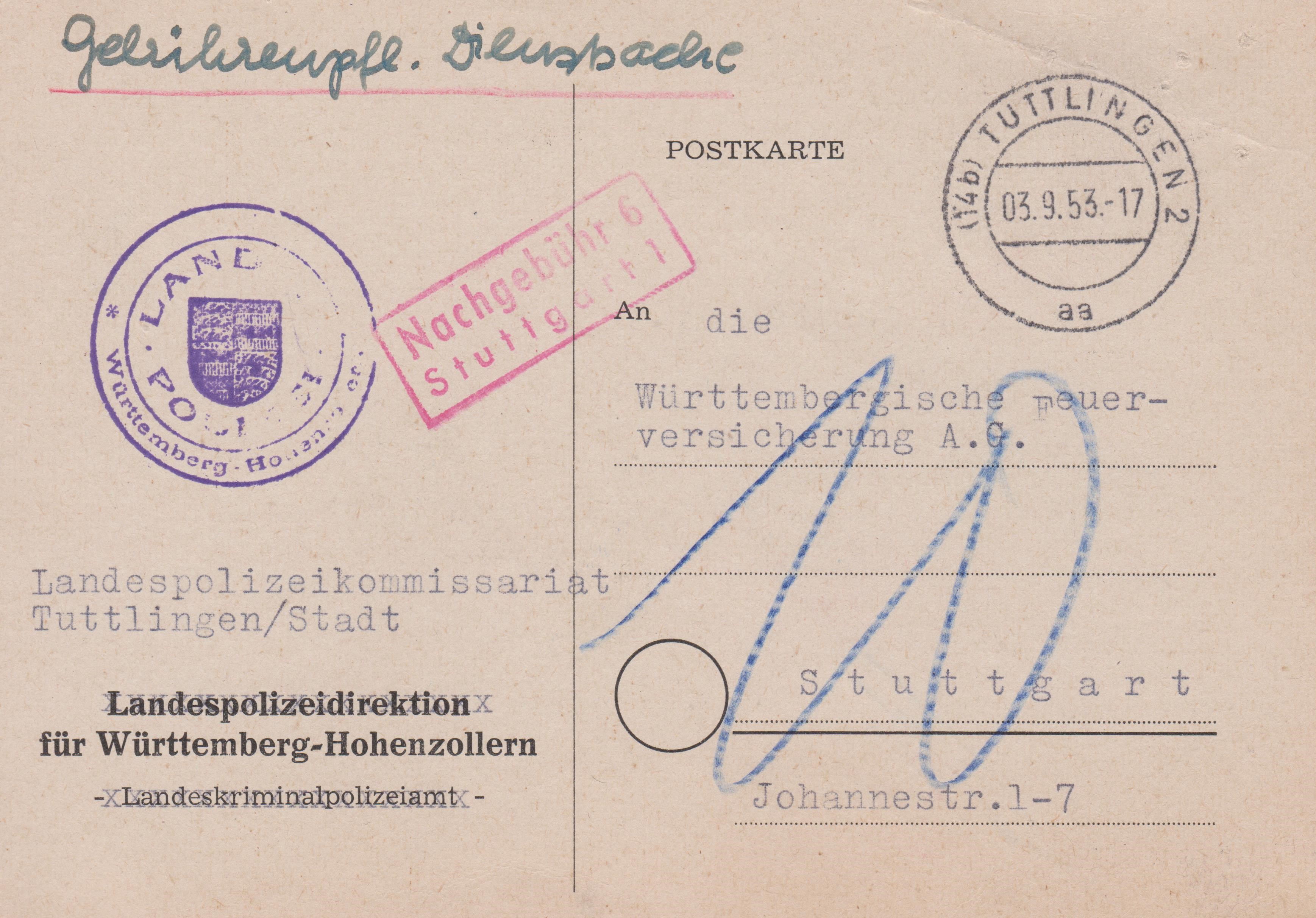 Das einfache Porto für eine Postkarte in Höhe von "10" Pf wurde per Blaustift als vom Empfänger zu zahlende "Nachgebühr" ausgewiesen, was ein Hinweisstemel mit Ortsangabe "Stuttgart 1" in Rot dokumentiert!