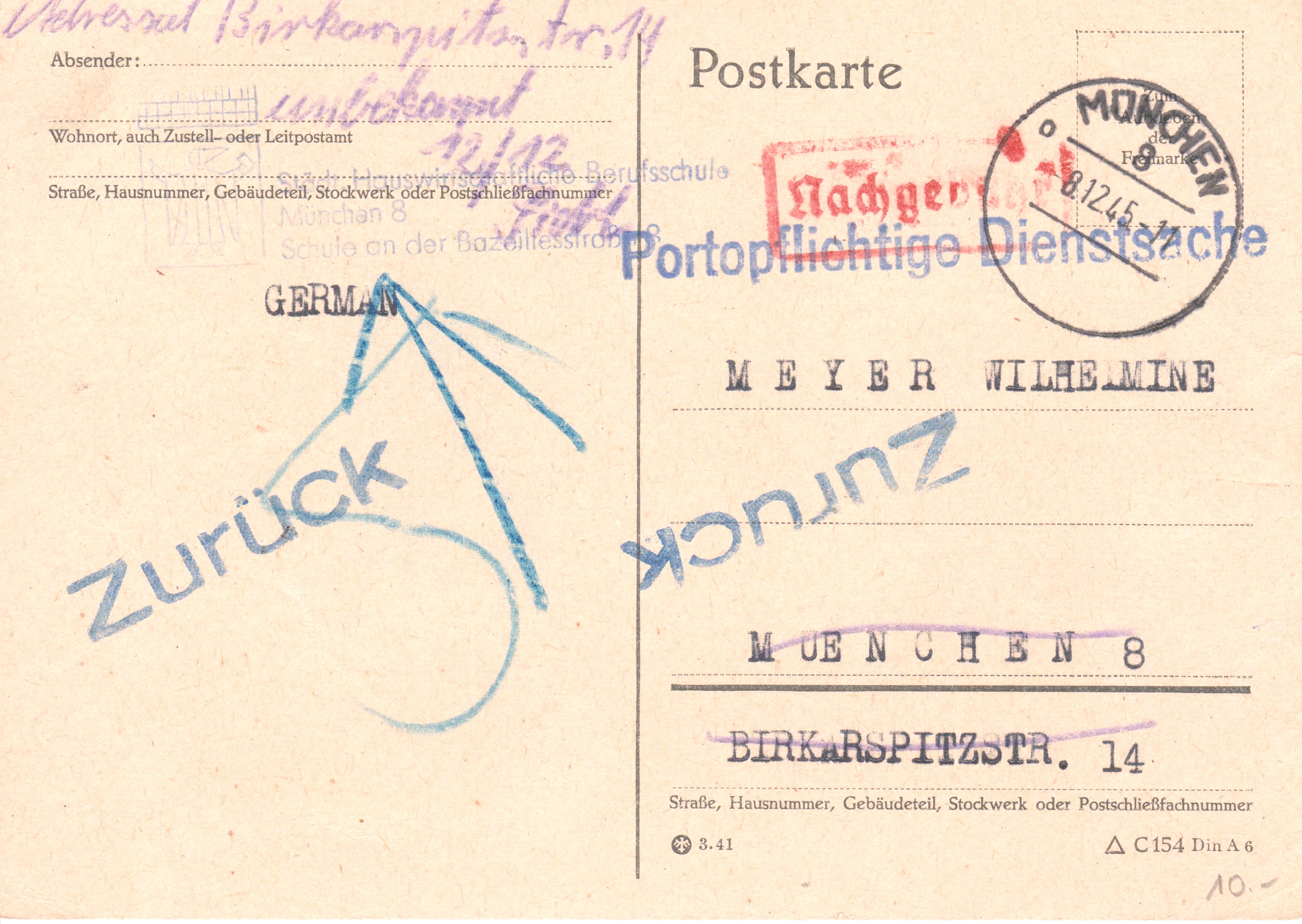 Postkarte, gelaufen im Ortsverkehr von München, Portostufe 5 Pf, am 08.12.1945 unfrankiert aufgegeben, was ein Blankoabschlag eines Tagesstempels "MÜNCHEN 8 o" dokumentiert, aus dem der Propagandazusatz entfernt wurde: