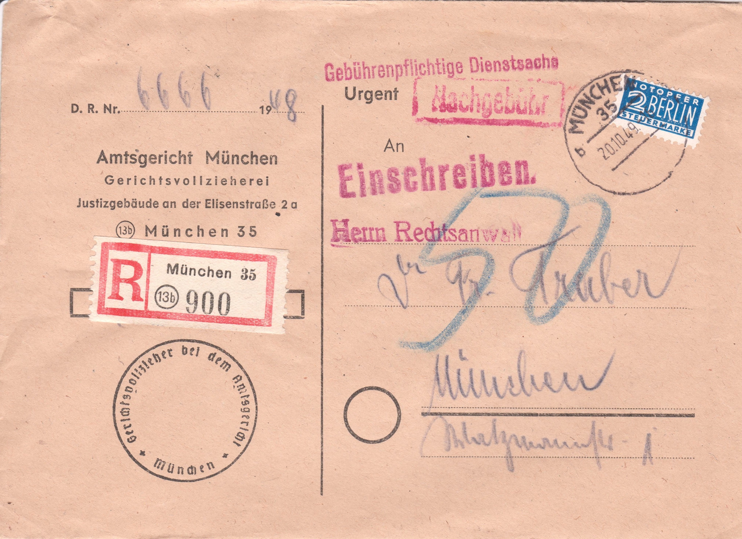Gebührenpflichtige Dienstsache, aufgegeben am 20.10.1949 per Einschreiben im Ortsverkehr von München.