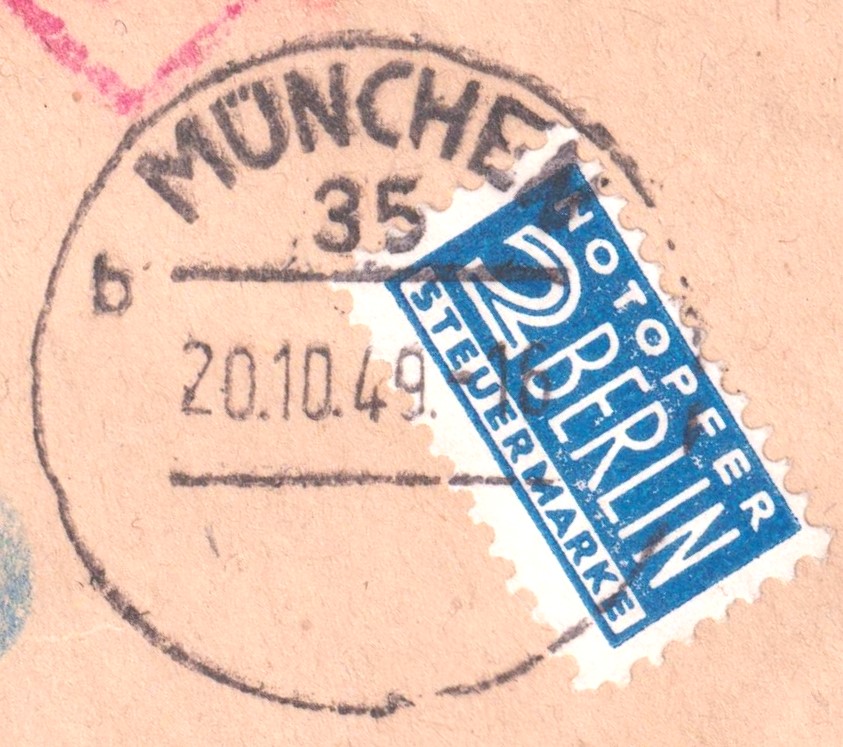 Als Aufgabestempel diente ein aptierter Tagesstempel MÜNCHEN 35 b, aus dem unten der ursprüngliche Text entfernt worden war: