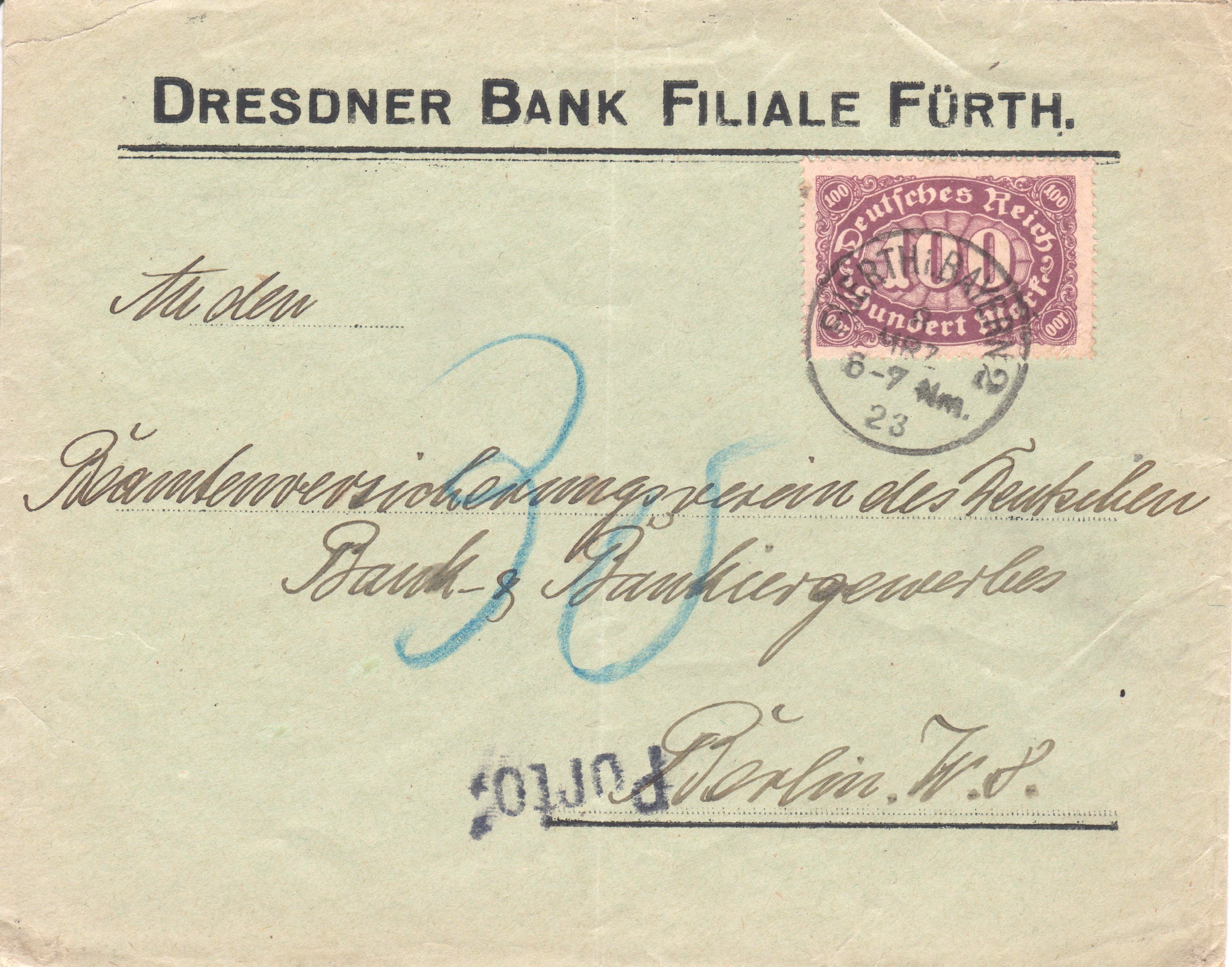 Bankbrief, adressiert nach Berlin W 8, frankiert mit 100 Mark aufgegeben in FÜRTH am 09.03.1923: