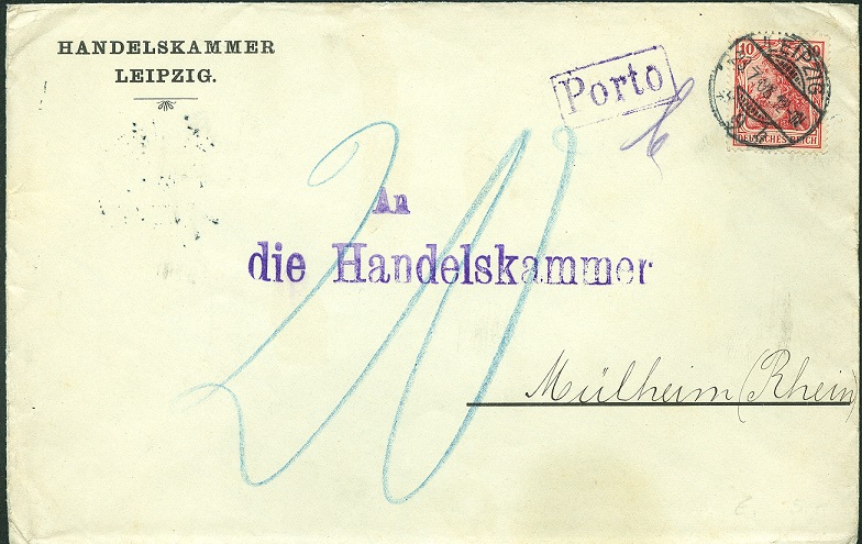Da zu dieser Zeit das Doppelte des Fehlportos als Nachporto erhoben wurde resultieren eigentlich nur 20 Pfennig als Nachporto.