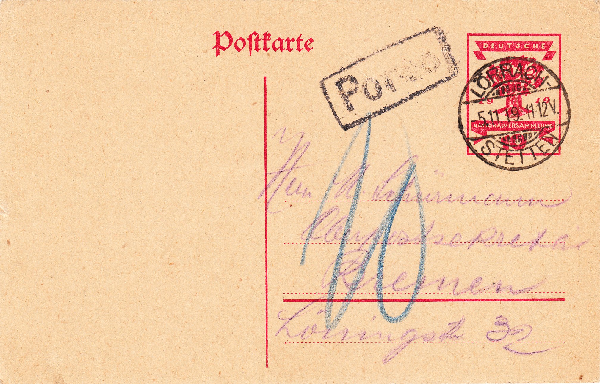 Diese Postkarte wurde am 05.11.1919 in Lörrach nur, dem Porto für eine Postkarte im Ortsverkehr entsprechend, mit 10 Pfennig freigemacht: