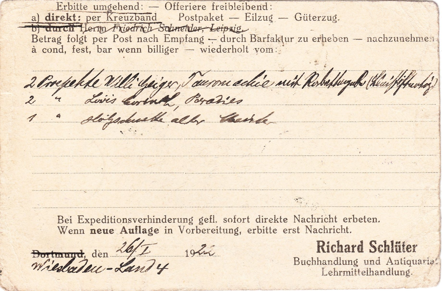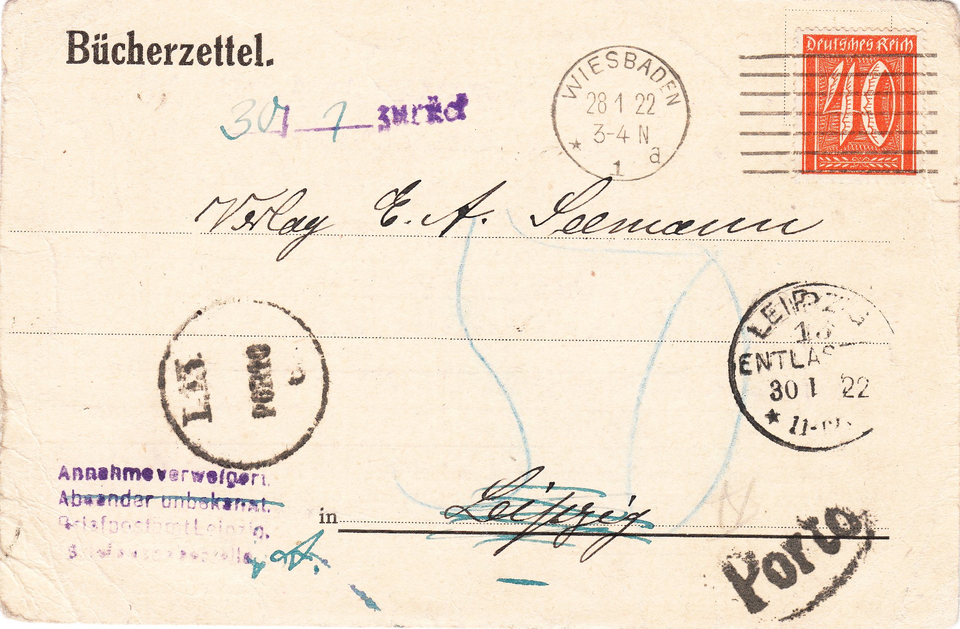 Diese Sendung wurde am 28.01.1922 frankiert mit 40 Pfennig als Sendungsart "Bücherzettel" in Kartenform in Wiesbaden aufgegeben: