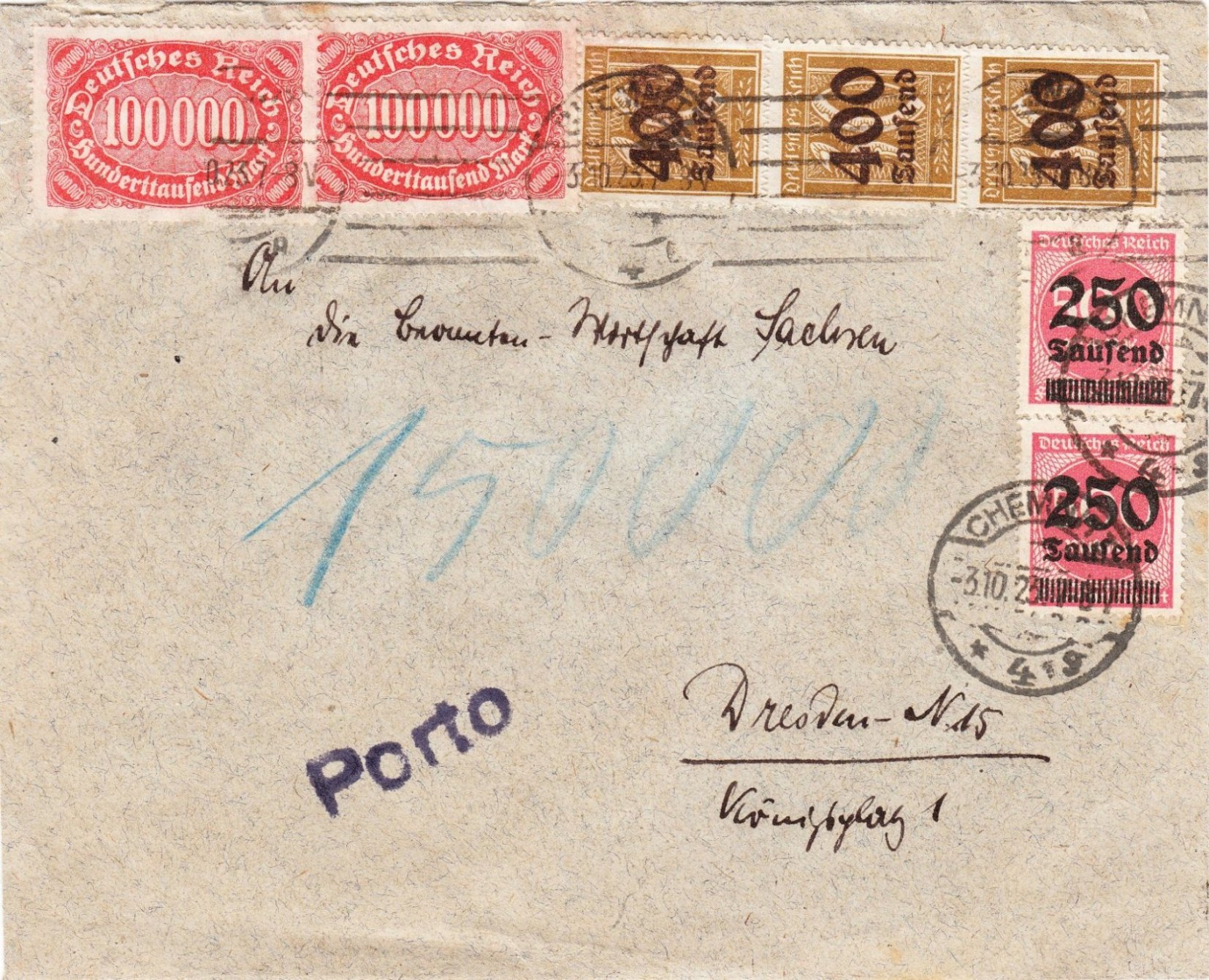 Dieser nach Dresden adressierte, am 03.10.1923 in Chemnitz aufgegebene Brief wurde statt mit 2000000 Mark nur mit 1900000 Mark frankiert:
