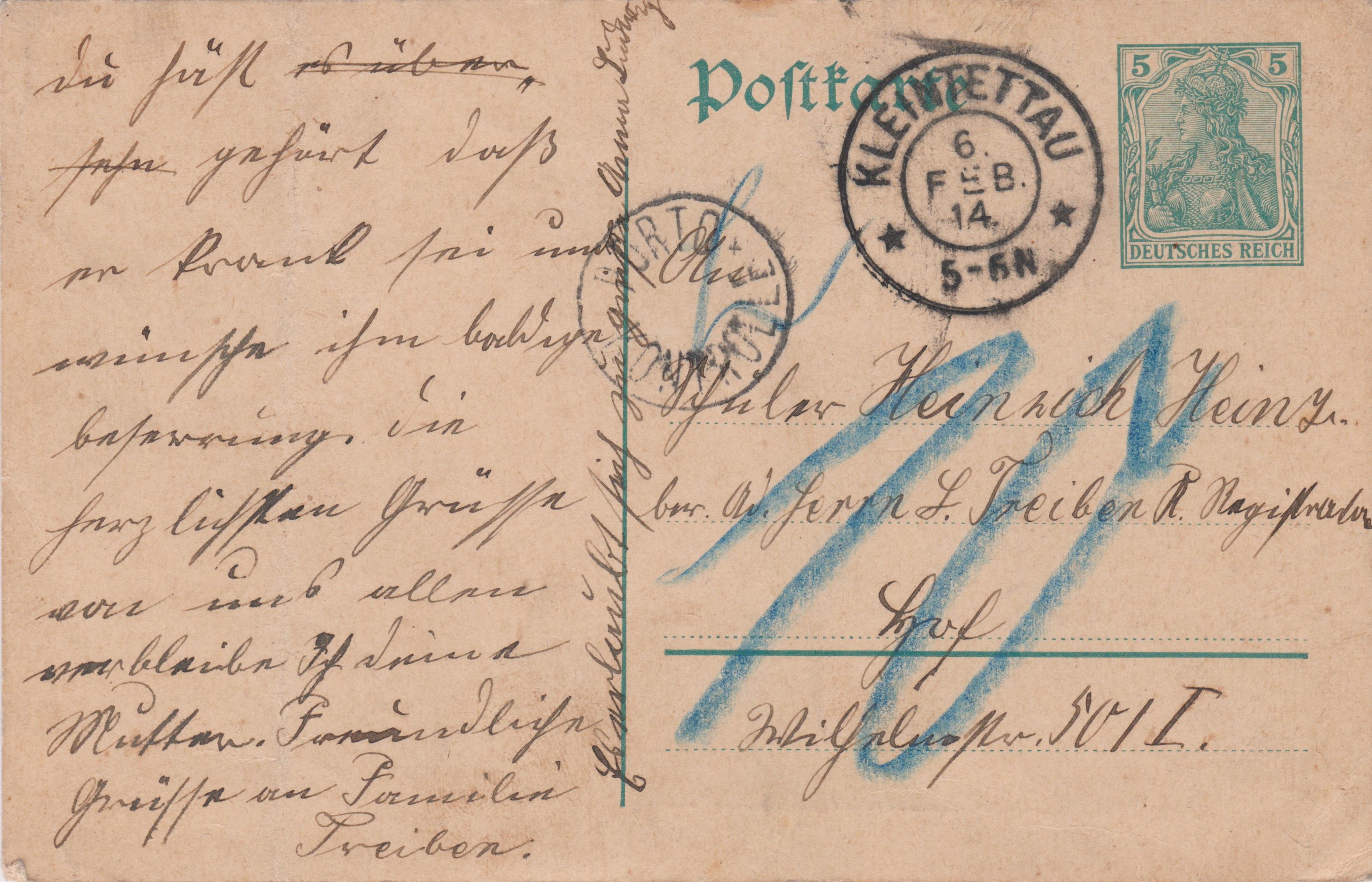 Postkarte, adressiert nach HOF, aufgegeben am 06.02.1914 in "KLEINTETTAU" in Bayern, wo die Germaniamarke des Deutschen Reiches nicht gültig war und der Tagesstempel daher neben den Postwertzeicheneindruck gesetzt wurde: