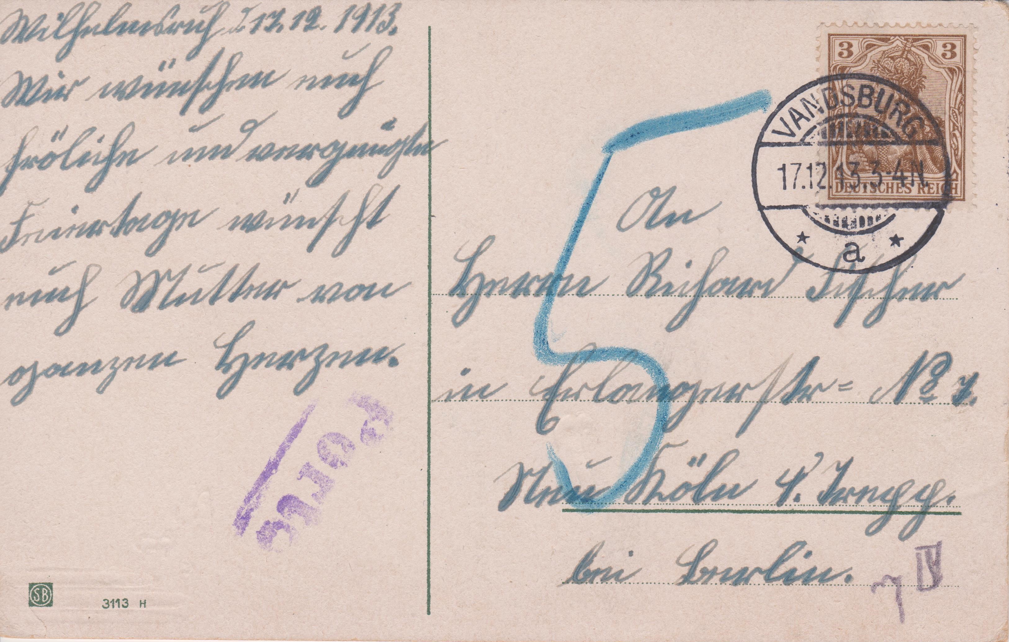 Nach Köln adressierte Postkarte, mit 3 Pf Germania frankiert aufgegeben am 17.12.1913 in VANDSBURG: