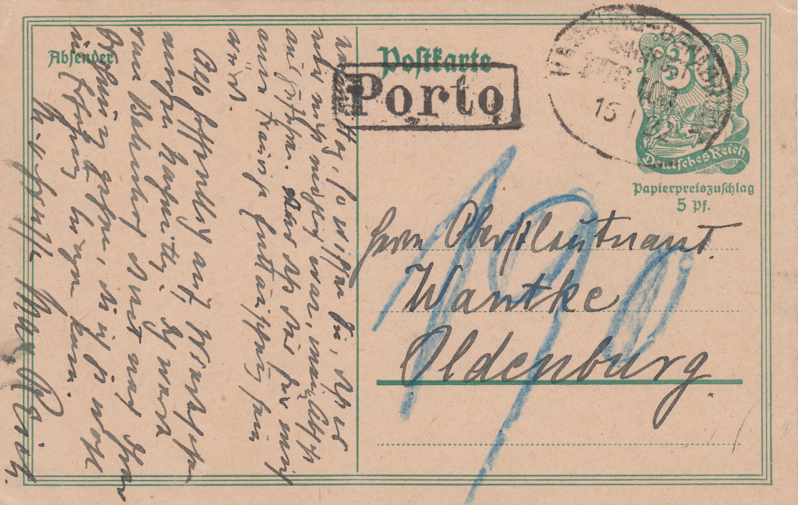 Das Porto für eine Postkarte im Fernverkehr betug 5 Pfennig. Somit fehlten 2 Pfennig und dafür wurde die Mindestgebühr von "5" Pfennig per Blaustift als vom Empfänger zu zahlender Betrag ausgewiesen, was ein Stempel "Porto" dokumentiert.