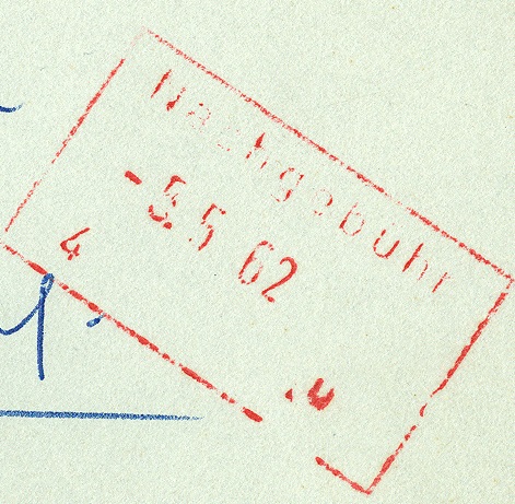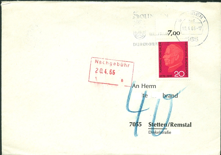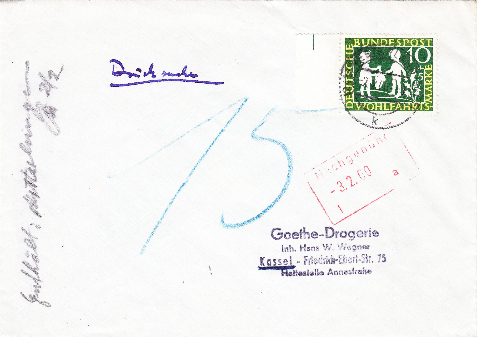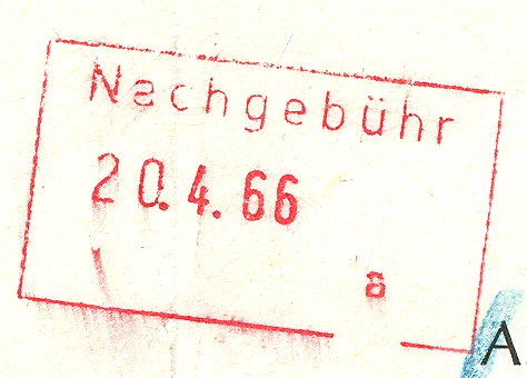 Das Eineinhalbfache des Portounterschiedes in Höhe von 10 Pfennig, also 15 Pfennig, erhob die Post als Nachgebühr, wies diesen Betrag auf der Vorderseite in Blaustift aus und brachte einen Hinweisstempel in Rot an so wie bei diesem Beleg, der im Ortsverkehr von Nürnberg lief: