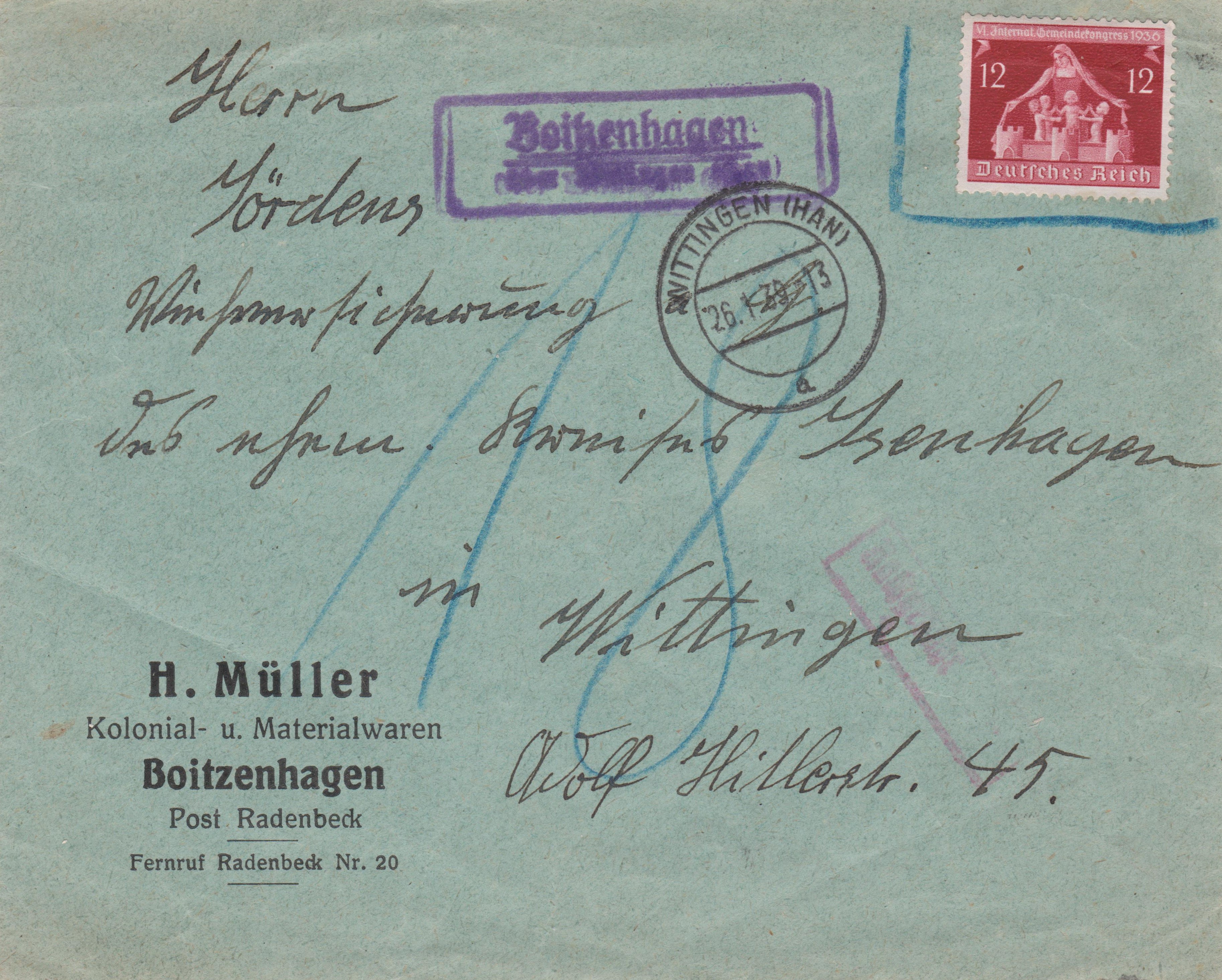 Da dieses Postwertzeichen lediglich bis zum 31.12.1937 gültig gewesen war wurde es im Januar 1939 in Boitzenhagen mit Blaustift umrahmt und der Landpoststempel daneben abgeschlagen. An seinem Bestimmungsort WITTINGEN kam der Brief am 26.01.1939 um 13 Uhr an.