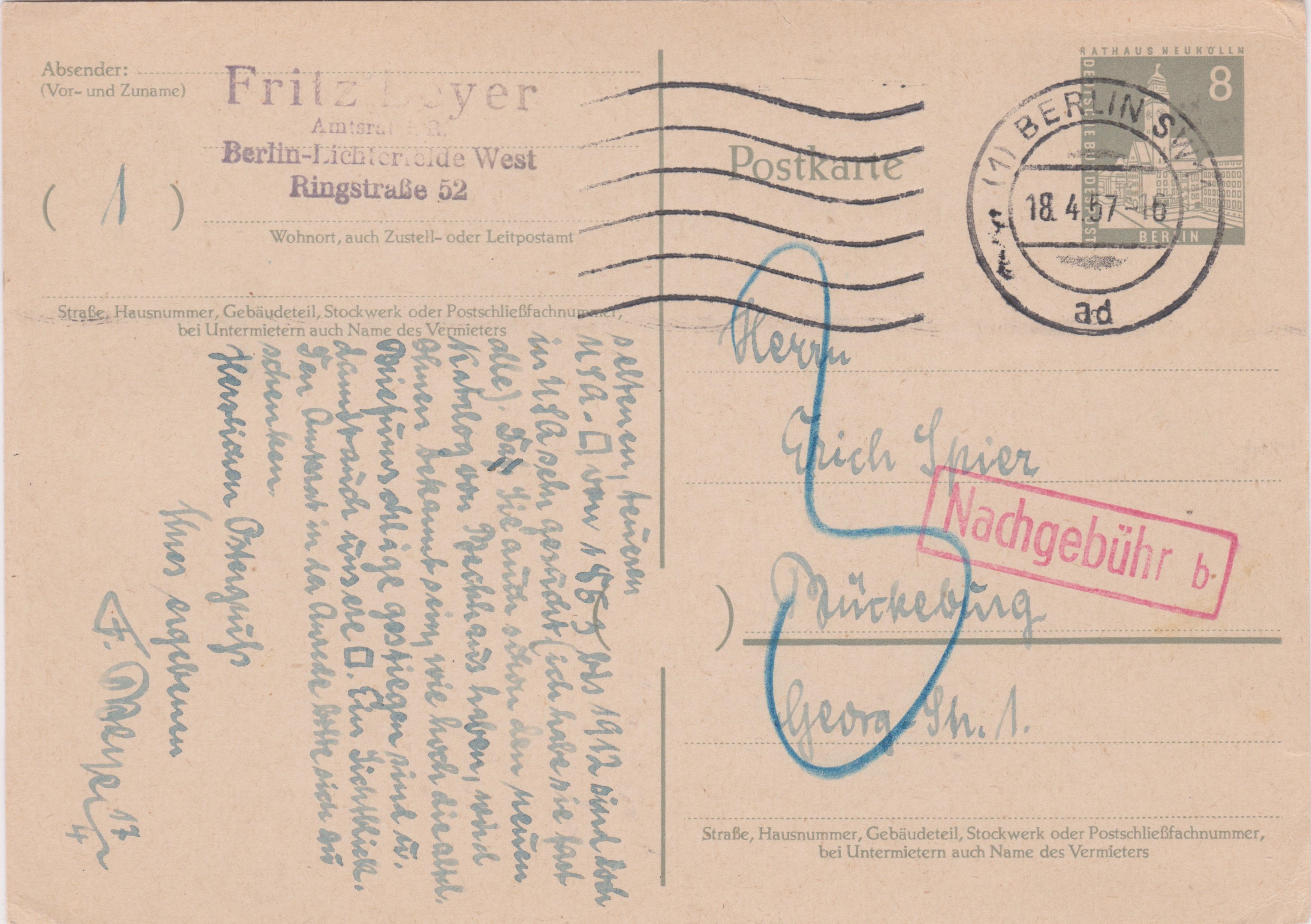 "18" Pfennig wurden als das Eineinhalbfache des Fehlportos von 12 Pf für einen Brief im Fernverkehr in Blaustift ausgewiesen und als Nachgebühr erhoben, worauf ein Stempel "Nachgebühr" in rot hinweist.
