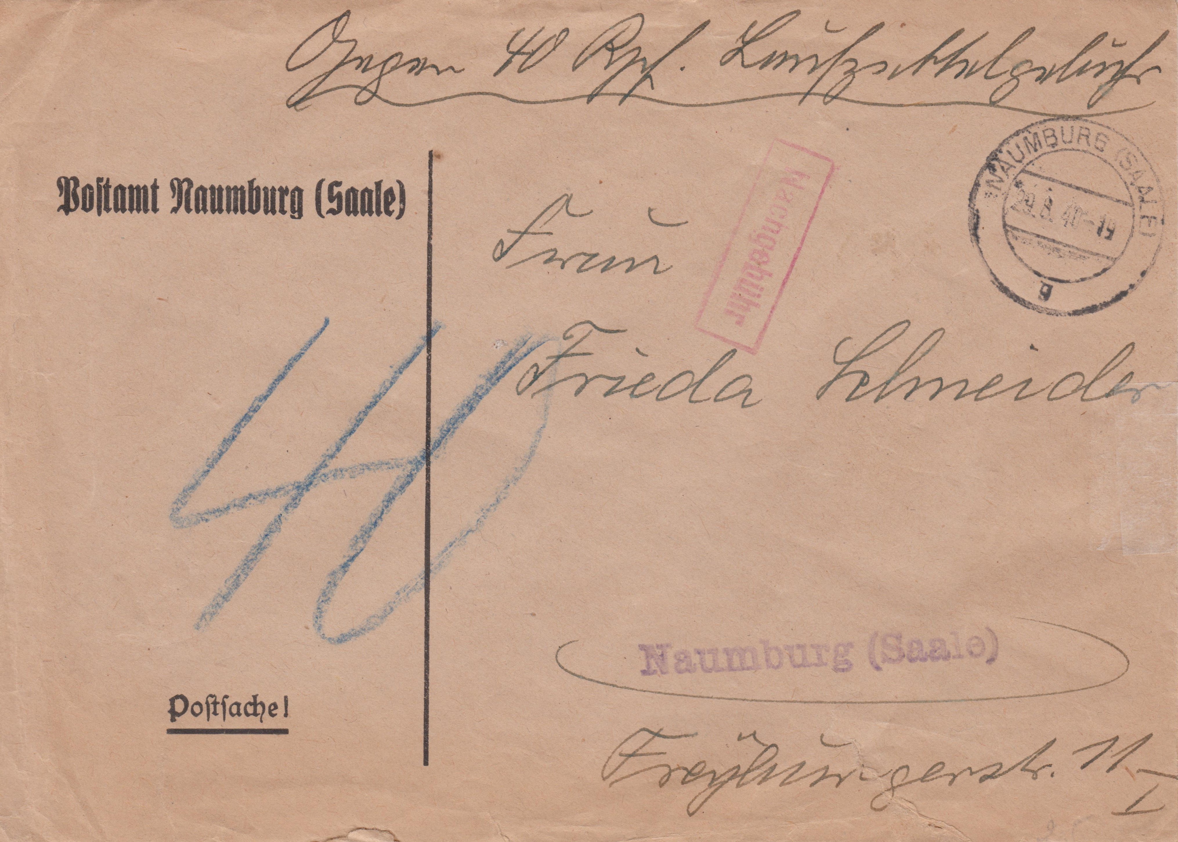 Einzeiliger Rahmenstempel (R1) "Nachgebühr" vom Postamt Naumburg (Saale) auf Postsache.