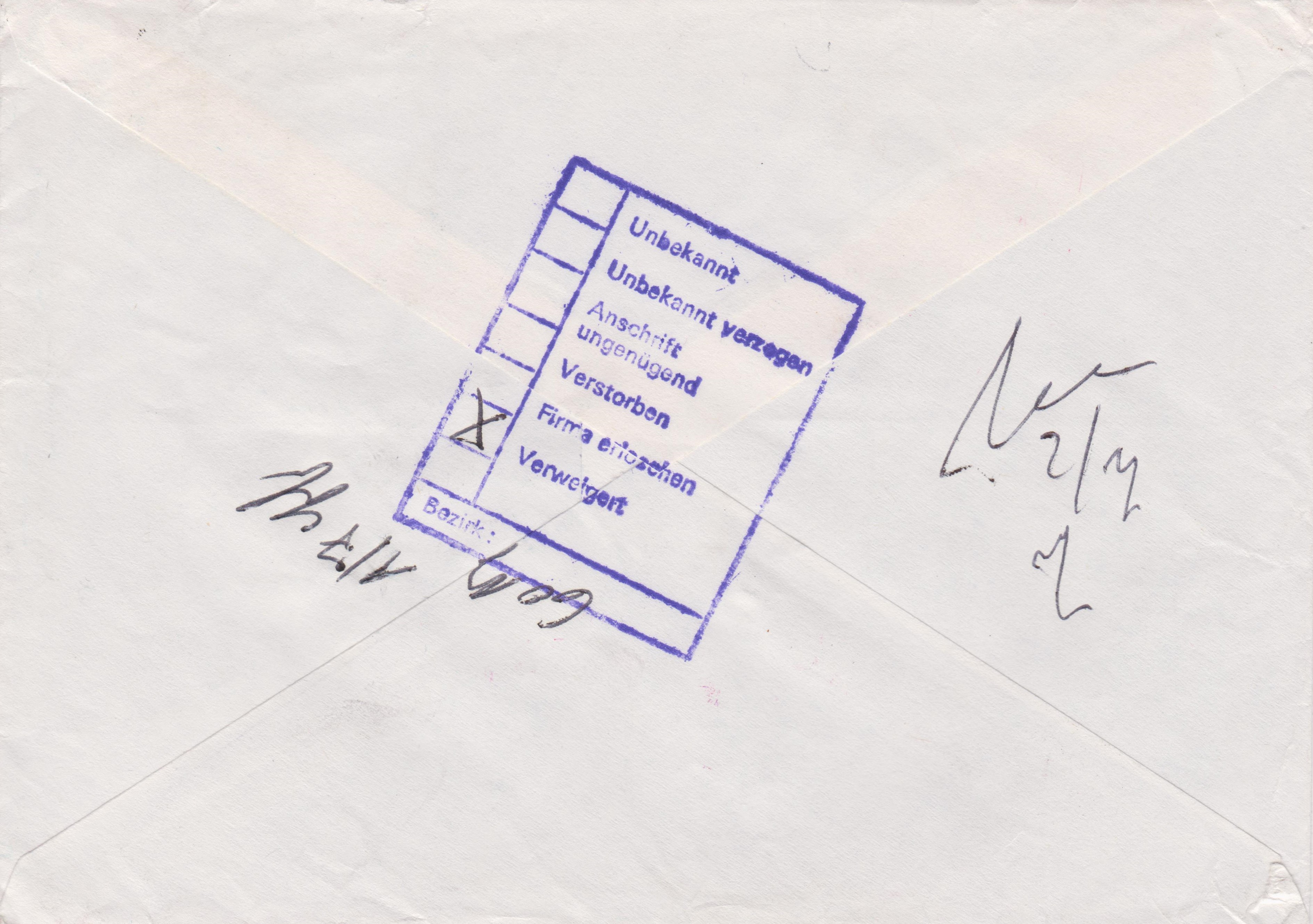 Der Empfänger verweigerte die Annahme und der Brief ging an den Absender "Zurück 60 Su", der die 130 Pf Nachgebühr zahlen mußte!