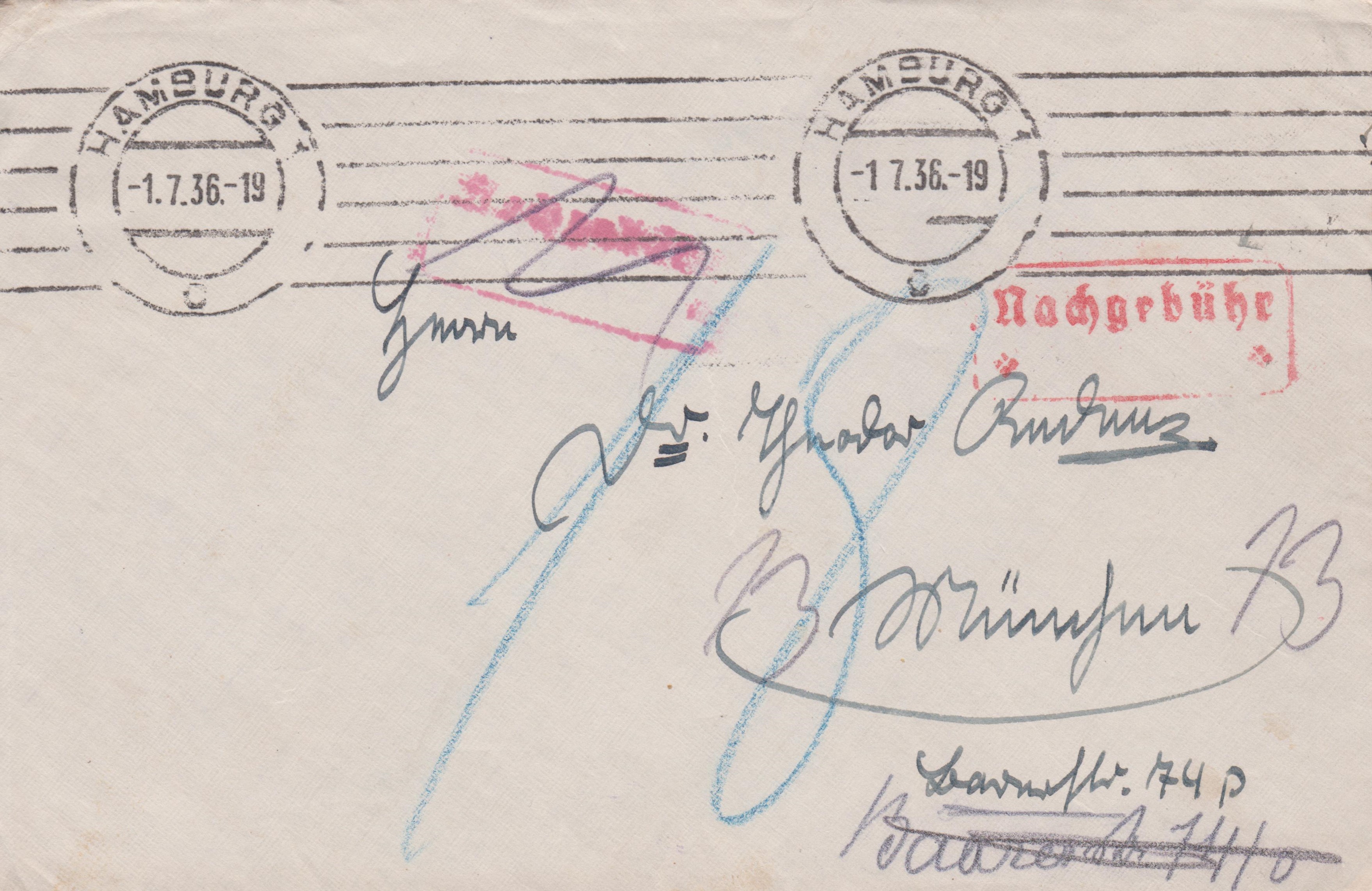 Dieser nach München adressierte Brief wurde am 01.07.1936 unfrankiert in HAMBURG 1 aufgegeben, was ein Maschinenstempel dokumentiert: