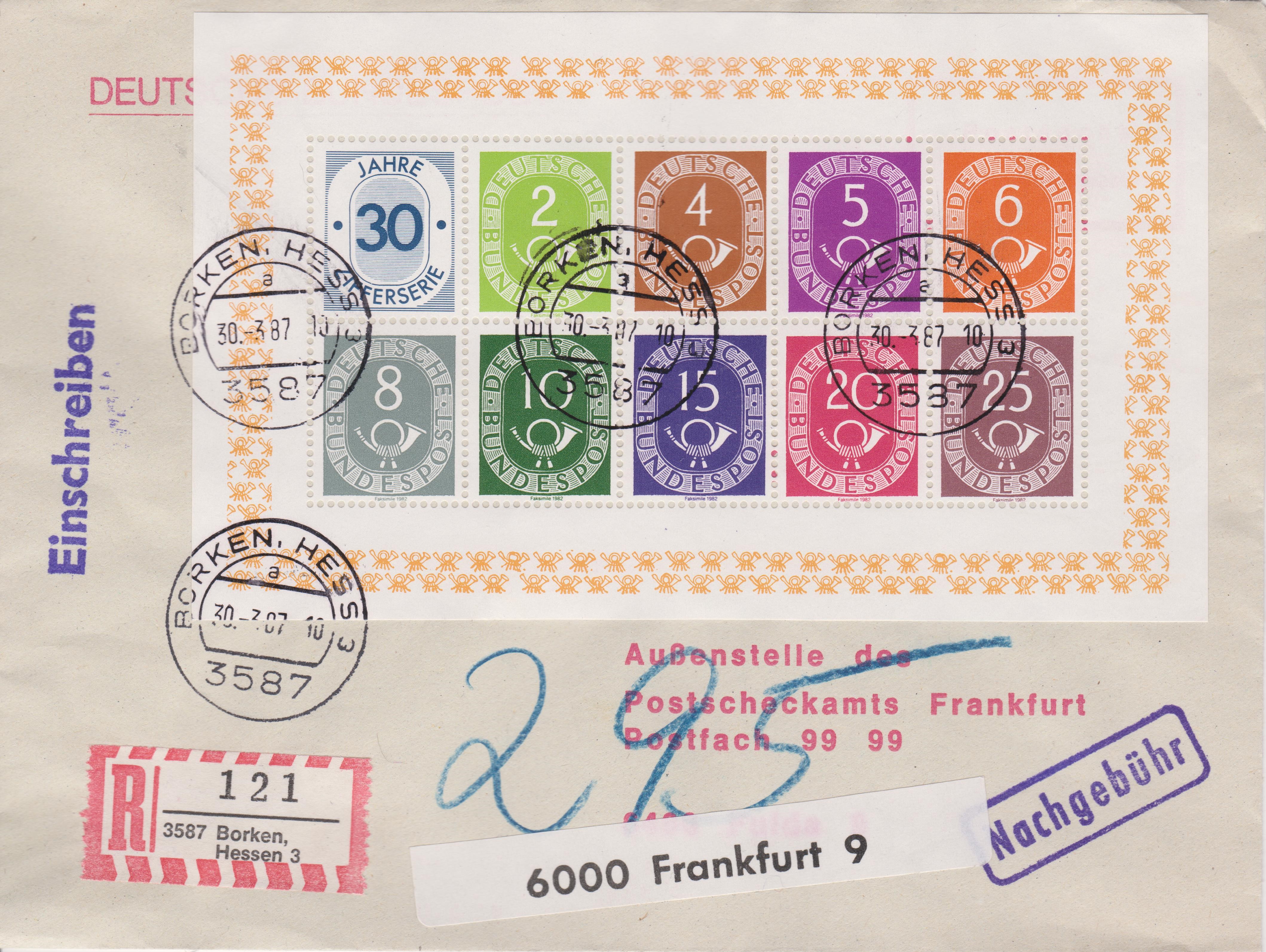 Brief per Einschreiben, "frankiert" mit einer Vignette der Dauerserie Posthorn, am 30.03.1987 in 3587 BORKEN, HESS 3 eingeliefert und per Tagesstempel "enwertet":