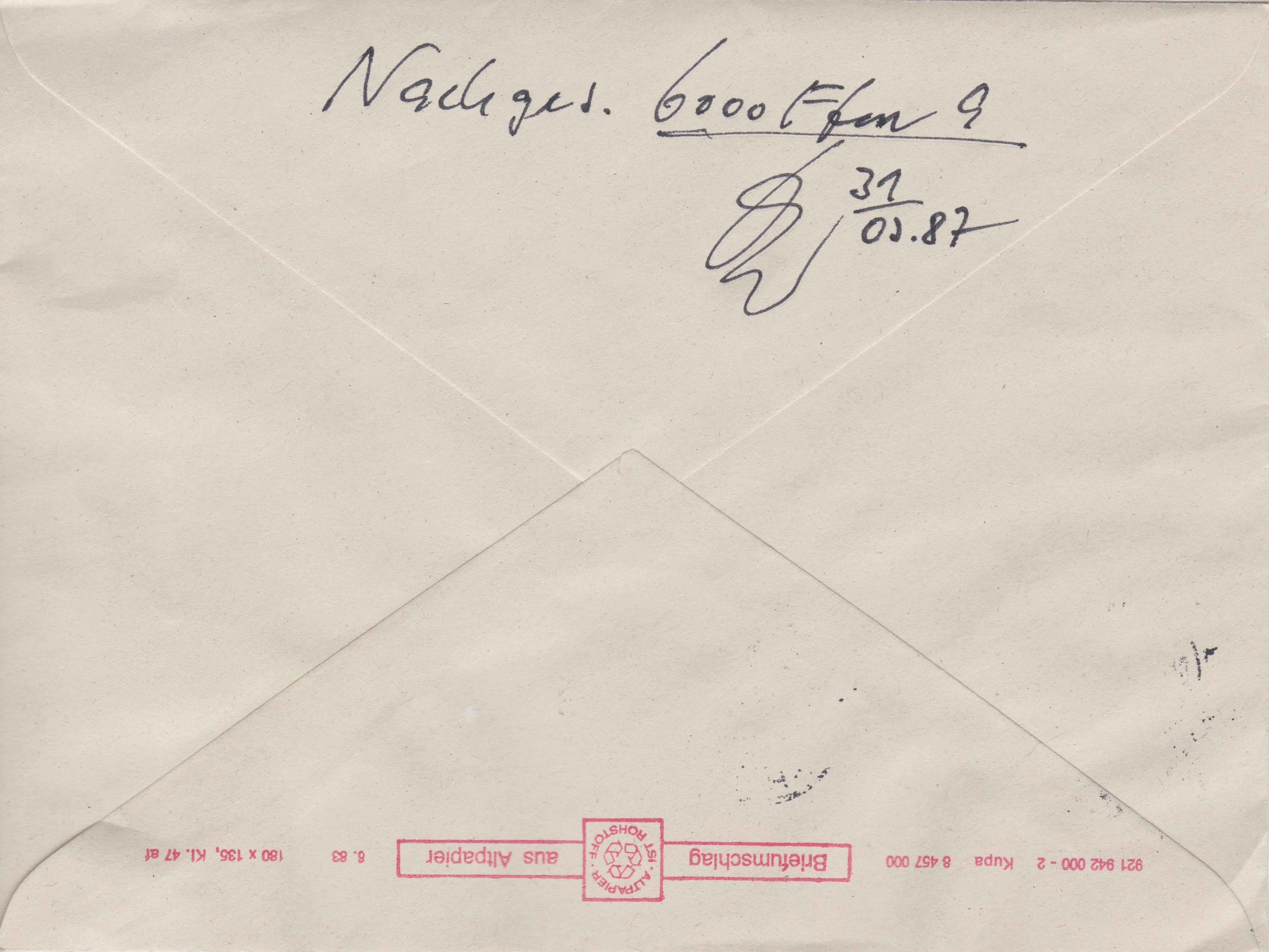Beim Postamt am Bestimmungsort 6000 Frankfurt 9 fiel am 31.03.1987 auf, dass dieser Brief nicht mit gültigen Postwertzeichen frankiert worden war und die Sendung wurde mit "295" Pf als "Nachgebühr" belegt!