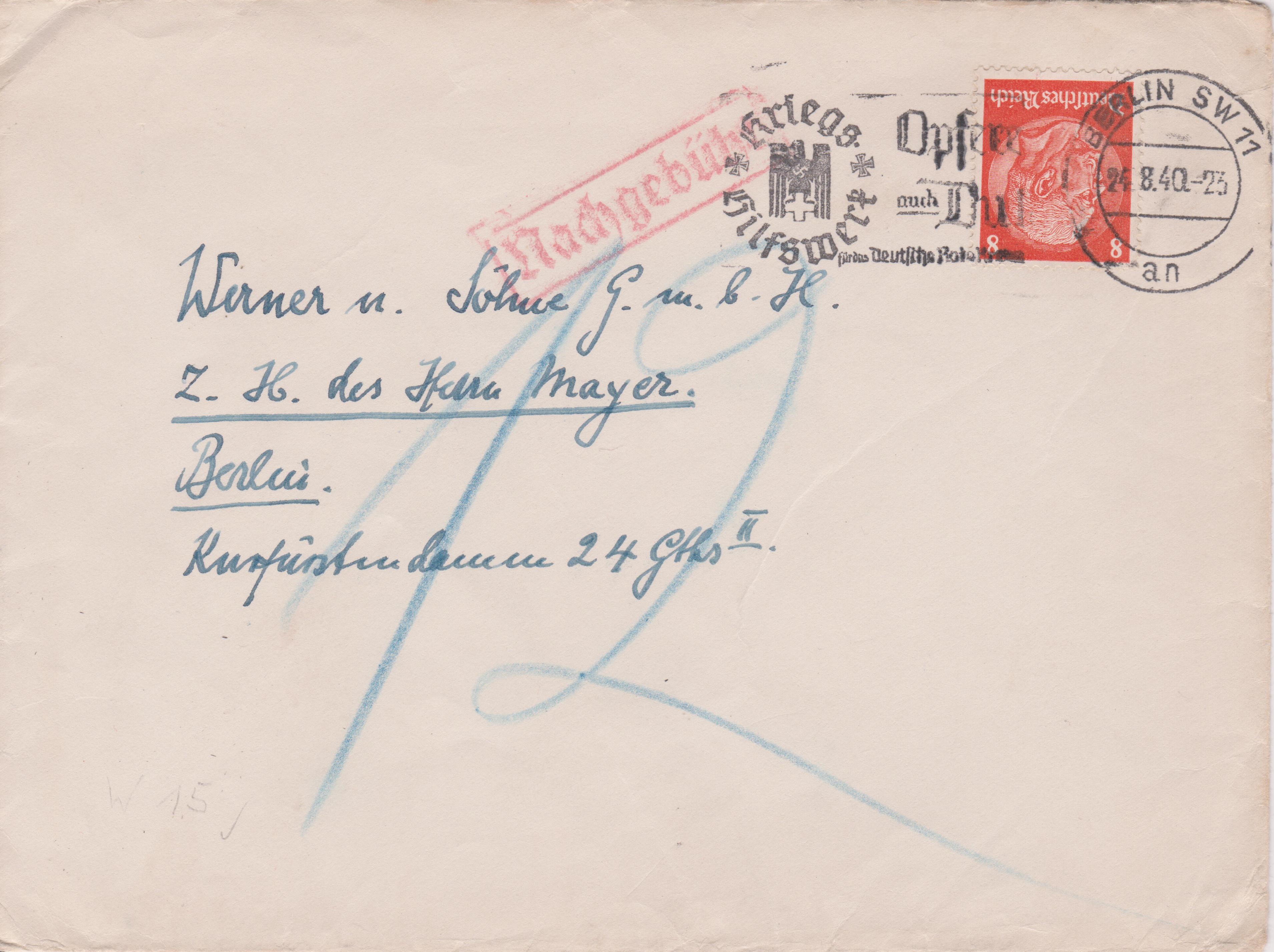 Ortsbrief aus Berlin, am 24.08.1940 der ersten Gewichtsstufe bis 20 Gramm entsprechend mit 8 Pf frankiert und in BERLIN SW 11 per Maschinenstempel entwertet: