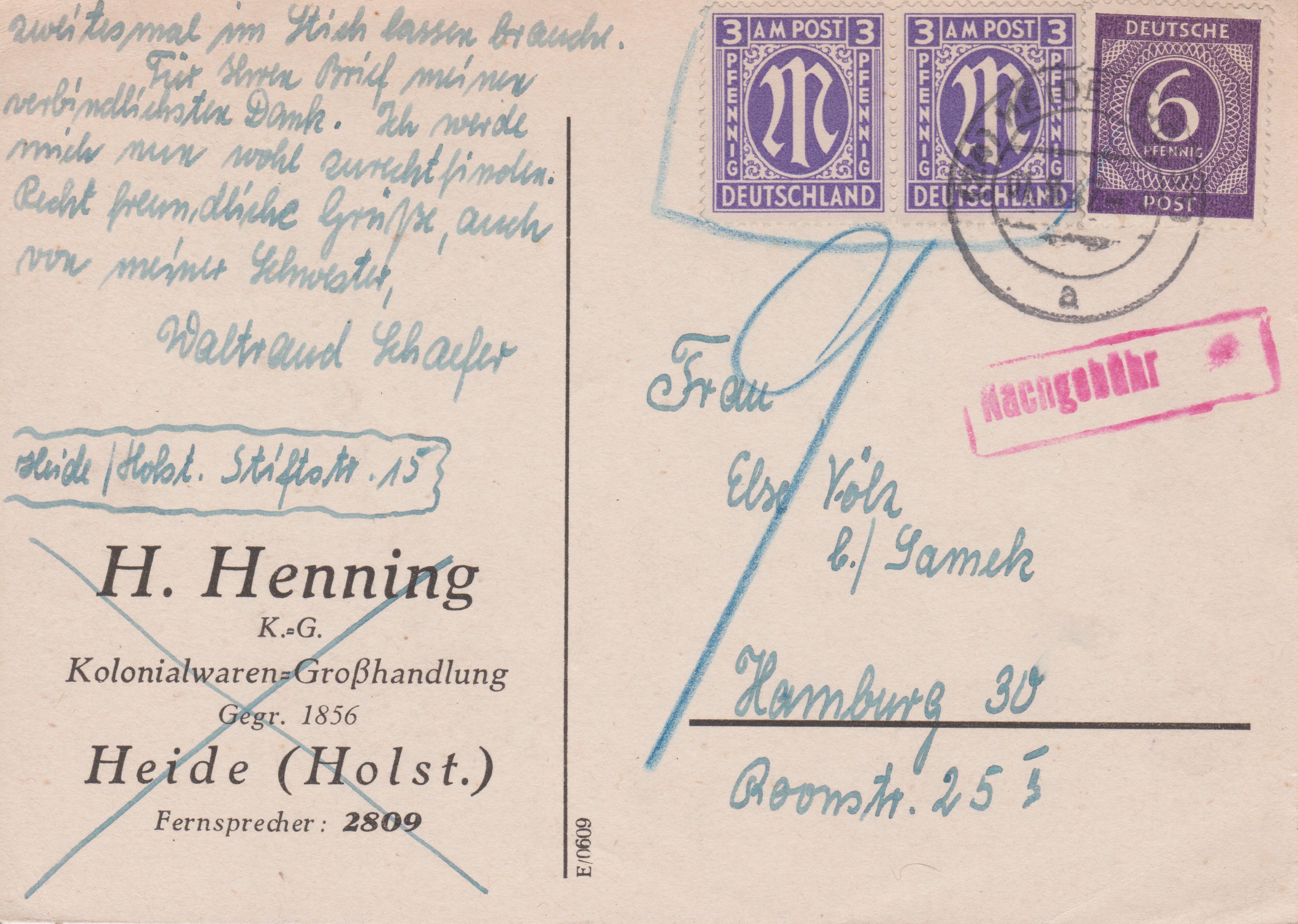 Diese nach Hamburg adressierte Postkarte wurde am 01.09.1947 in Heide aufgegeben:
