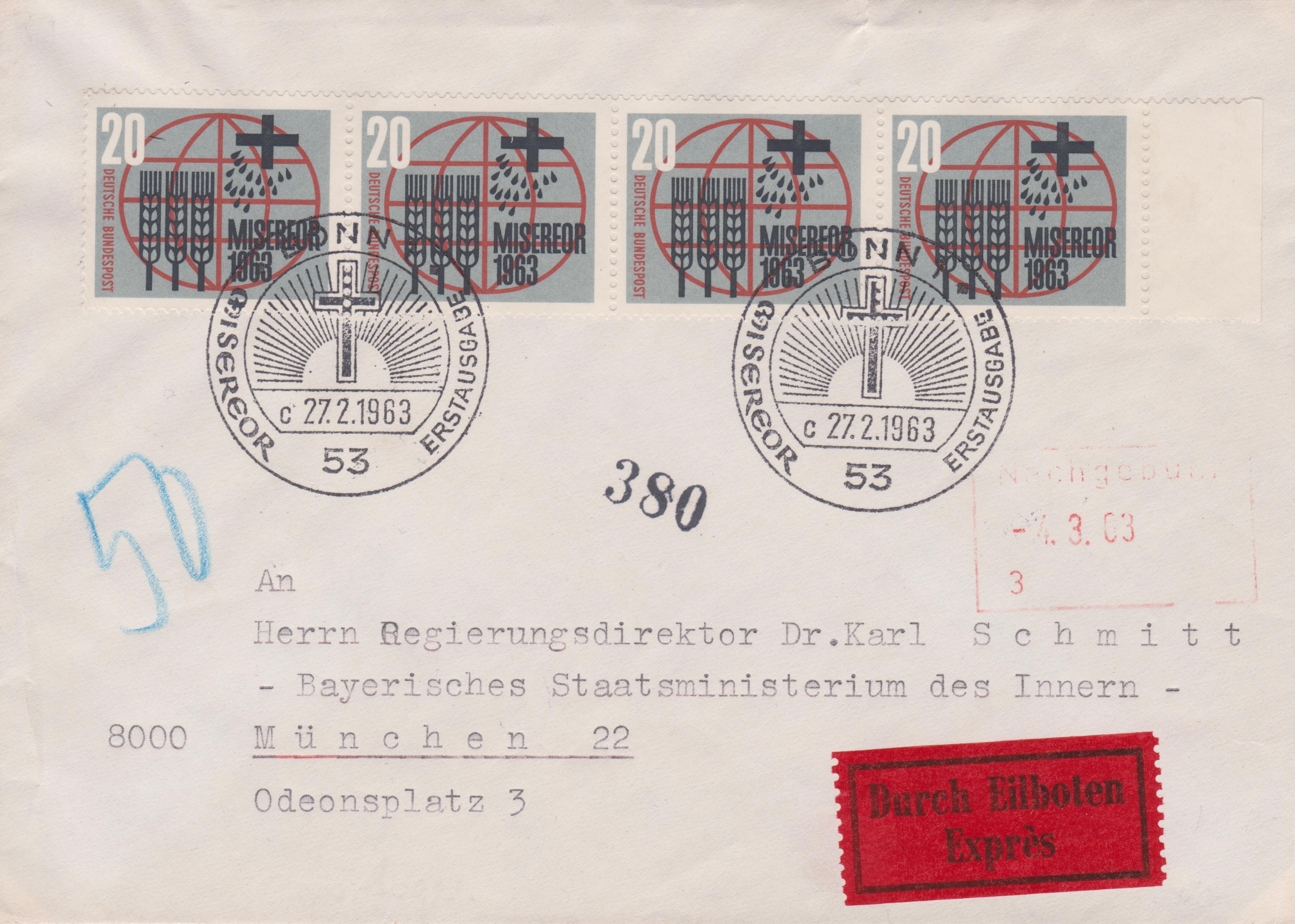 Ersttagsbrief per Eilboten, frankiert mit einem waagerechten Viererstreifen Bund MiNr. 391, adressiert nach München: