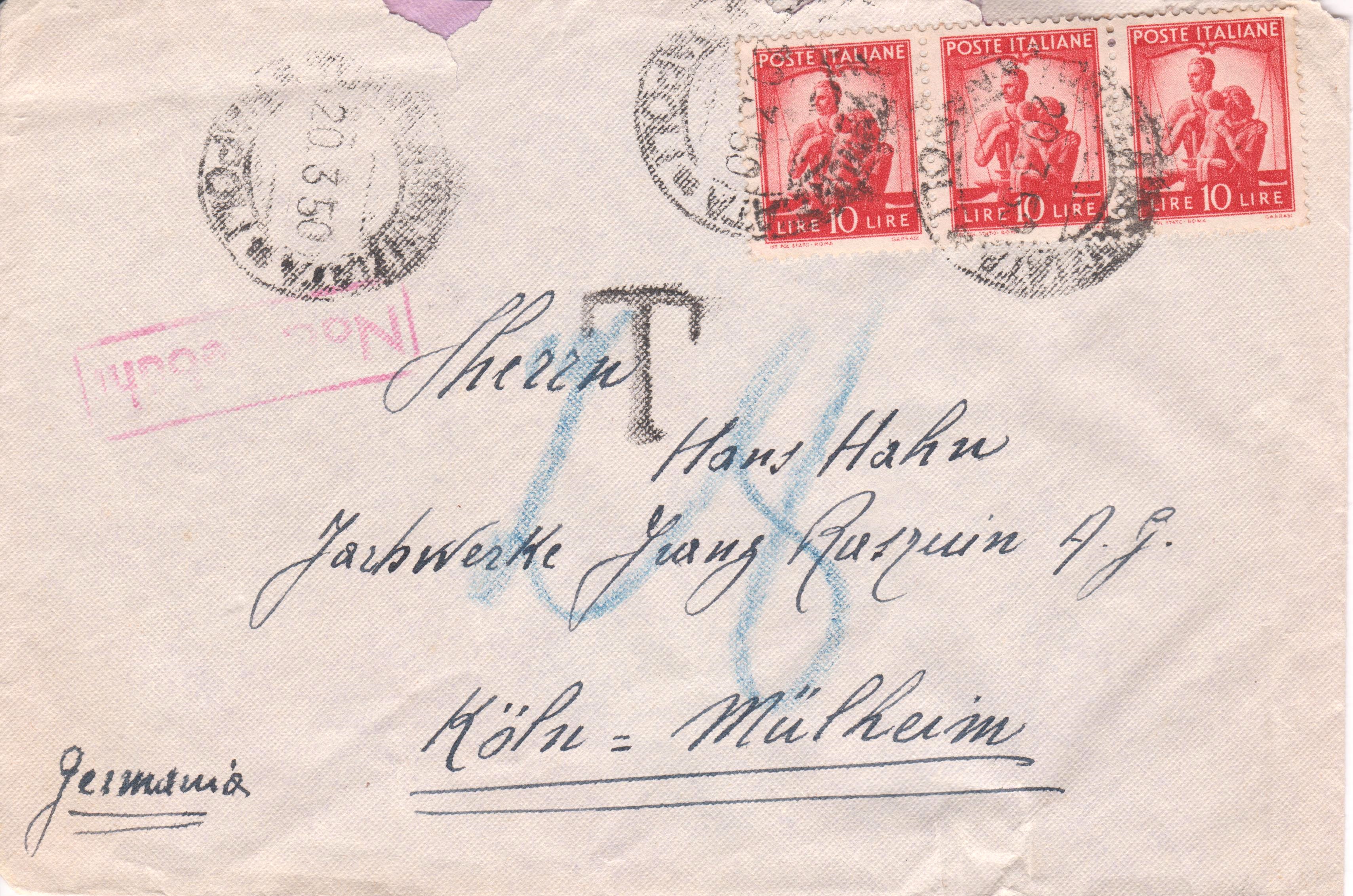 Brief, adressiert nach Köln-Mülheim, frankiert mit 30 LIRE aufgegeben am 20.03.1950 in NAPOLI (= Neapel) in Italien: