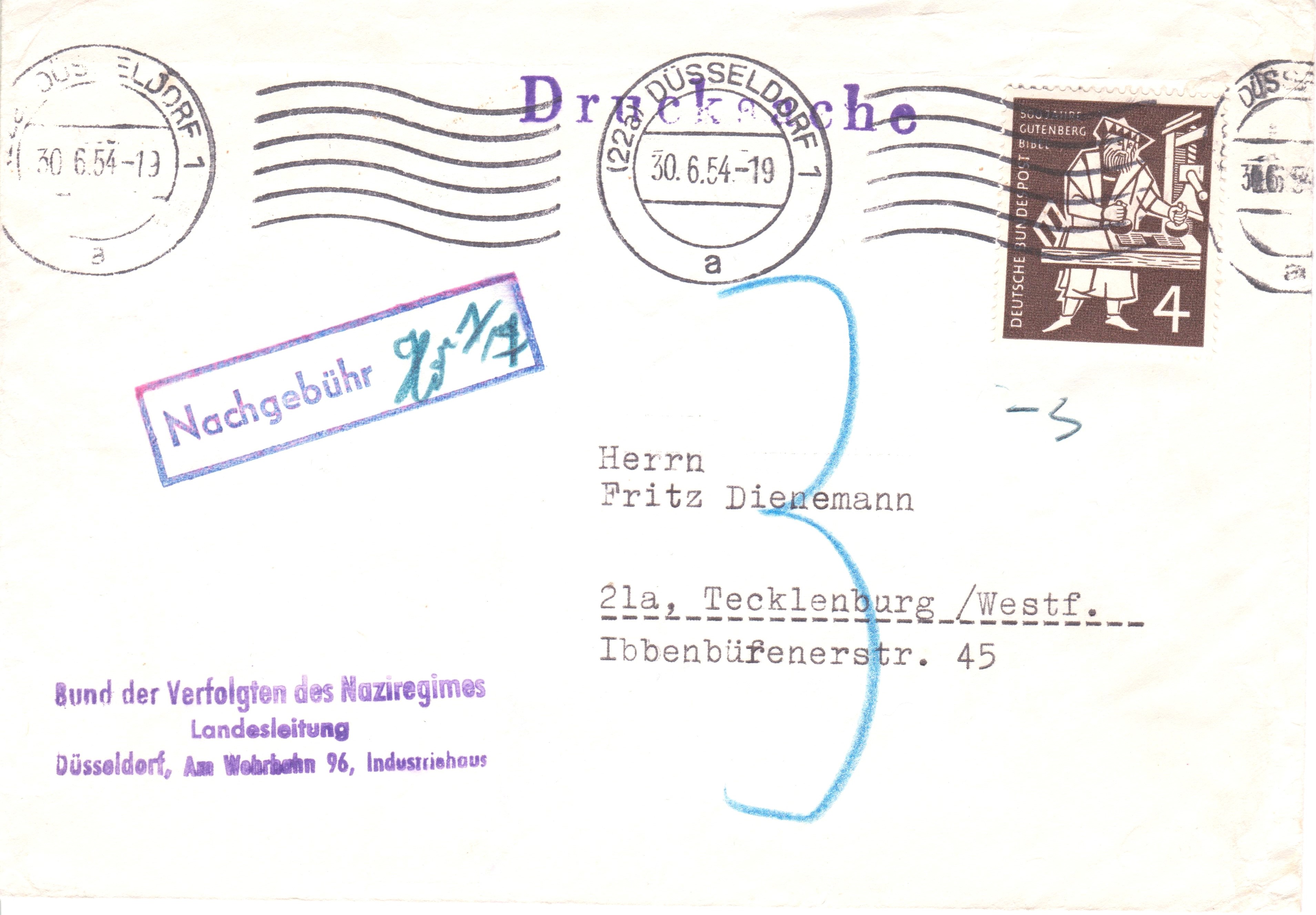Drucksache, am 30.06.1954 als Standarddrucksache bis 20 g portorichtig freigemacht mit 4 Pf: